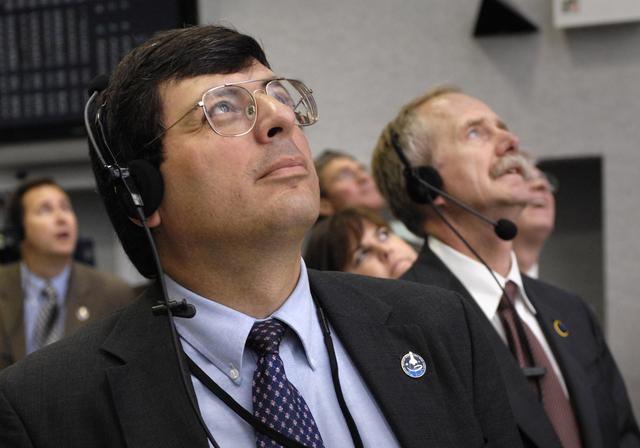 KENNEDY SPACE CENTER, FLA. -- In the firing room at NASA's Kennedy Space Center, NASA Associate Administrator Chris Scolese (left) and associate administrator for NASA Space Operations Bill Gerstenmaier (right) watch the space shuttle Discovery launch on mission STS-120. Liftoff was on time at 11:38:19 am. EDT. Discovery carries the Italian-built U.S. Node 2, called Harmony. During the 14-day STS-120 mission, the crew will install Harmony and move the P6 solar arrays to their permanent position and deploy them. Discovery is expected to complete its mission and return home at 4:47 a.m. EST on Nov. 6. Photo credit: NASA/Bill Ingalls