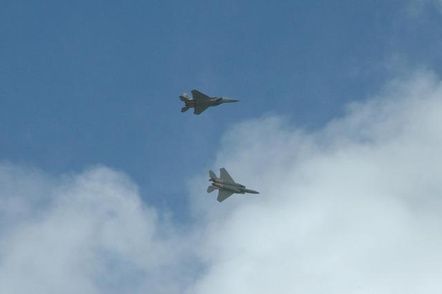 KENNEDY SPACE CENTER, FLA. -- Two of the U.S. Navy F-18 Super Hornets practice their maneuvers over NASA's Kennedy Space Center. The jets are participating in the World Space Expo being held from Nov. 1 to Nov. 4 at the NASA Kennedy Space Center Visitor Complex. Other aircraft joining in the salute include U.S. Air Force Thunderbirds Aerial Demonstration Squadron , U.S. Air Force F-22 Raptor, U.S. Air Force F-15 Eagle, the P-51 Mustang Heritage Flight and the U.S. Air Force 920th Rescue Wing, which was responsible for Mercury and Gemini capsule recovery. The U.S. Army Golden Knights also will demonstrate precision skydiving. The World Space Expo is an event to commemorate humanity's first 50 years in space while looking forward to returning people to the moon and exploring beyond. The expo will showcase various panels, presentations and educational programs. It also is a part of NASA's 50th anniversary celebrations, highlighting the 45th Anniversary of the Mercury Program celebration featuring original NASA astronauts John Glenn and Scott Carpenter and the Pioneering Women of Aerospace forum featuring Eileen Collins and other prominent female space veterans. The agency was founded Oct. 1, 1958. Photo credit: NASA/Jack Pfaller