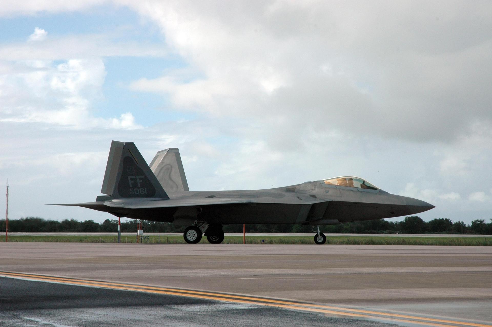 KENNEDY SPACE CENTER, FLA. -- A U.S. Air Force F-22 Raptor arrives at the Shuttle Landing Facility at NASA's Kennedy Space Center. The plane is participating in the World Space Expo being held from Nov. 1 to Nov. 4 at the NASA Kennedy Space Center Visitor Complex. Other aircraft joining in the salute include U.S. Air Force Thunderbirds Aerial Demonstration Squadron, U.S. Navy F-18 Super Hornets, the P-51 Mustang Heritage Flight and the U.S. Air Force 920th Rescue Wing, which was responsible for Mercury and Gemini capsule recovery. The U.S. Army Golden Knights also will demonstrate precision skydiving. The World Space Expo is an event to commemorate humanity's first 50 years in space while looking forward to returning people to the moon and exploring beyond. The expo will showcase various panels, presentations and educational programs. It also is a part of NASA's 50th anniversary celebrations, highlighting the 45th Anniversary of the Mercury Program celebration featuring original NASA astronauts John Glenn and Scott Carpenter and the Pioneering Women of Aerospace forum featuring Eileen Collins and other prominent female space veterans. The agency was founded Oct. 1, 1958. Photo credit: NASA/Jack Pfaller