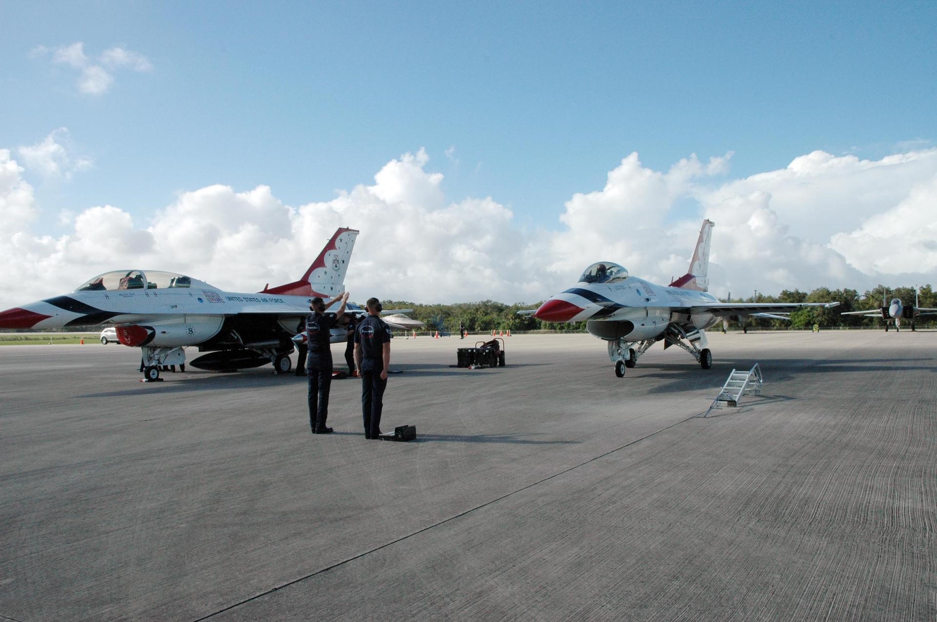 KENNEDY SPACE CENTER, FLA. -- Another of the U.S. Air Force Thunderbirds is parked on the Shuttle Landing Facility at NASA's Kennedy Space Center. The aerial demonstration squadron is performing for the World Space Expo being held from Nov. 1 to Nov. 4 at the NASA Kennedy Space Center Visitor Complex. Other aircraft participating in the salute include U.S. Air Force F-22 Raptor, U.S. Navy F-18 Super Hornet, U.S. Air Force F-15 Eagle, the P-51 Mustang Heritage Flight and the U.S. Air Force 920th Rescue Wing, which was responsible for Mercury and Gemini capsule recovery. The U.S. Army Golden Knights also will demonstrate precision skydiving. The World Space Expo is an event to commemorate humanity's first 50 years in space while looking forward to returning people to the moon and exploring beyond. The expo will showcase various panels, presentations and educational programs. It also is a part of NASA's 50th anniversary celebrations, highlighting the 45th Anniversary of the Mercury Program celebration featuring original NASA astronauts John Glenn and Scott Carpenter and the Pioneering Women of Aerospace forum featuring Eileen Collins and other prominent female space veterans. The agency was founded Oct. 1, 1958. Photo credit: NASA/Jack Pfaller