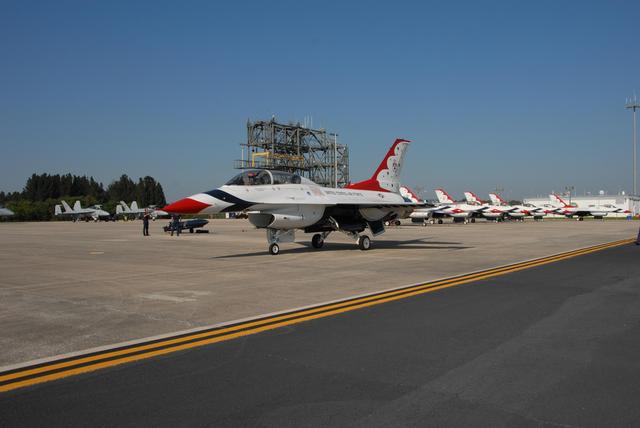 KENNEDY SPACE CENTER, FLA. — At the Shuttle Landing Facility at NASA's Kennedy Space Center, the U.S. Air Force Thunderbirds are ready to take off to participate in an aerial salute for the World Space Expo. Other aircraft joining in the expo salute include the U.S. Navy F-18 Super Hornets, U.S. Air Force F-22 Raptor, U.S. Air Force F-15 Eagle, P-51 Mustang Heritage Flight, the U.S. Air Force 920th Rescue Wing, which was responsible for Mercury and Gemini capsule recovery, and the U.S. Army Golden Knights demonstrating precision skydiving. The World Space Expo Nov. 1-4 was an event commemorating humanity's first 50 years in space while looking forward to returning people to the moon and exploring beyond. The expo showcased various panels, presentations and educational programs. It also was a part of NASA's 50th anniversary celebrations, highlighting the 45th Anniversary of the Mercury Program celebration featuring original NASA astronauts John Glenn and Scott Carpenter and the Pioneering Women of Aerospace forum featuring Eileen Collins and other prominent female space veterans. The agency was founded Oct. 1, 1958. Photo credit: NASA/George Shelton