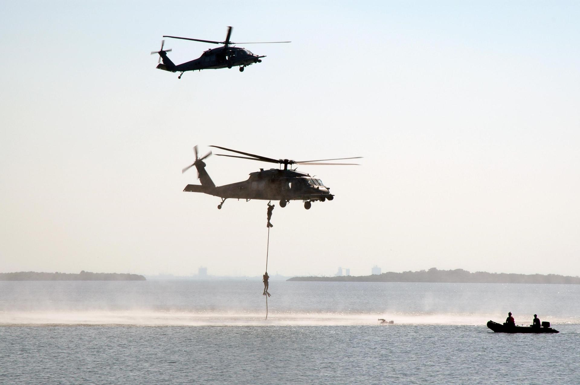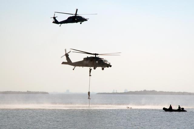 KENNEDY SPACE CENTER, FLA. -- In the water next to the NASA Causeway at NASA's Kennedy Space Center, part of the U.S. Air Force 920th Rescue Wing puts on a demonstration during the World Space Expo aerial salute. This unit was responsible for Mercury and Gemini capsule recovery. Other aircraft joining in the expo salute include the U.S. Air Force Thunderbirds Demonstration Squadron, the U.S. Navy F-18 Super Hornets, U.S. Air Force F-22 Raptor, U.S. Air Force F-15 Eagle, P-51 Mustang Heritage Flight, and the U.S. Army Golden Knights demonstrating precision skydiving. The World Space Expo held Nov. 1-4 was an event commemorating humanity's first 50 years in space while looking forward to returning people to the moon and exploring beyond. The expo showcased various panels, presentations and educational programs. It also was a part of NASA's 50th anniversary celebrations, highlighting the 45th Anniversary of the Mercury Program celebration featuring original NASA astronauts John Glenn and Scott Carpenter and the Pioneering Women of Aerospace forum featuring Eileen Collins and other prominent female space veterans. The agency was founded Oct. 1, 1958. Photo credit: NASA/Chris Chamberland