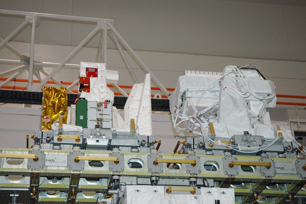KENNEDY SPACE CENTER, FLA. -- In the Space Station Processing Facility at NASA's Kennedy Space Center, the integrated cargo carrier-lite, or ICC-L, is ready to be lifted and placed in the payload canister for mission STS-122. Seen here are two of the elements mounted on top: on the left, the European technology Exposure Facility composed of nine science instruments and an autonomous temperature measurement unit, and on the right, the SOLAR payload designed for sun observation. The SOLAR will be transferred and stowed on the Columbus module during the third spacewalk of the mission. STS-122 is targeted for launch on Dec. 6 on space shuttle Atlantis. Photo credit: NASA/Amanda Diller