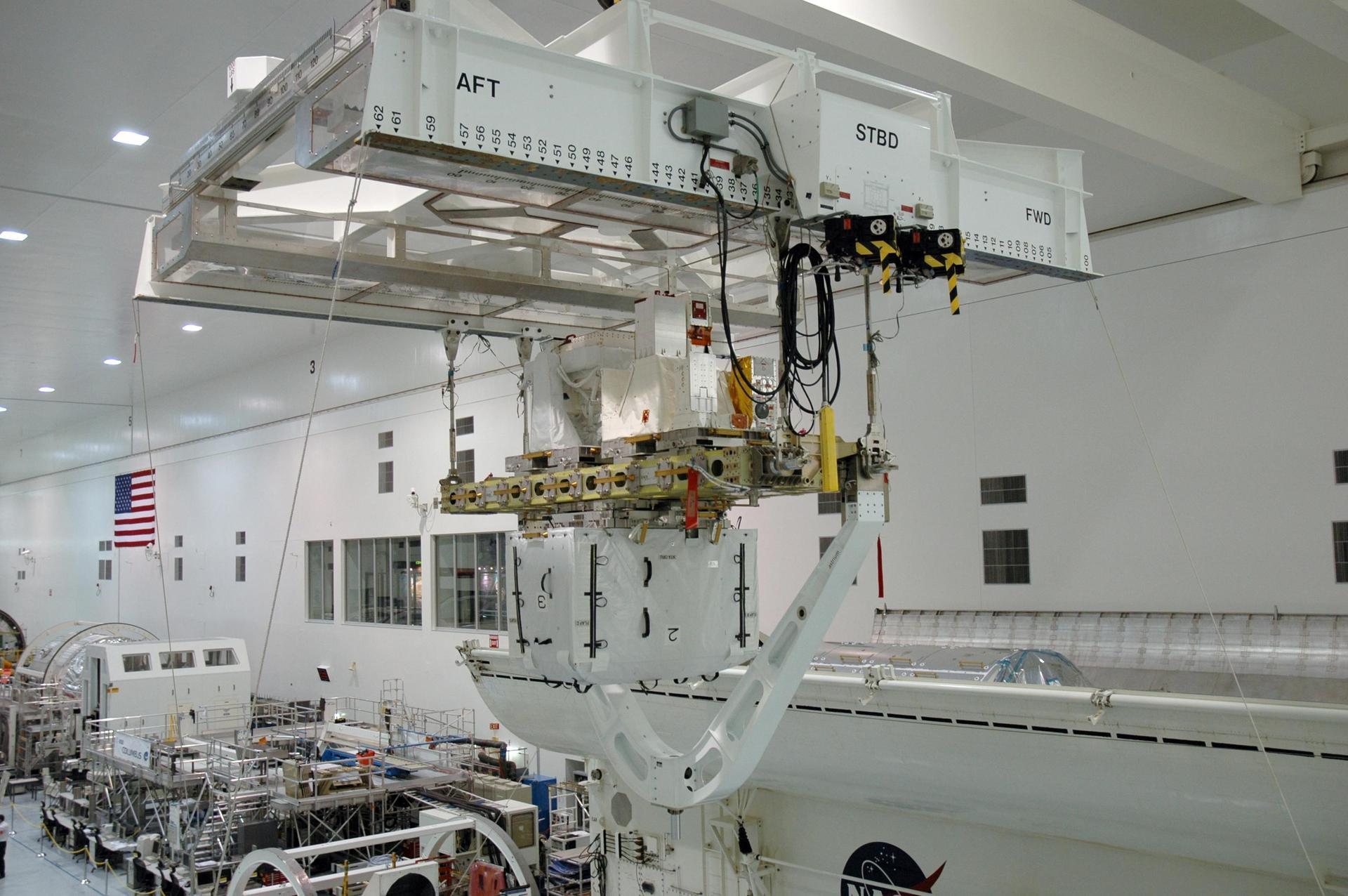 KENNEDY SPACE CENTER, FLA. --In the Space Station Processing Facility at NASA's Kennedy Space Center, an overhead crane moves the integrated cargo carrier-lite, or ICC-L, toward the payload canister at right. The ICC-L is an unpressurized cross-bay carrier providing launch and return transportation with the space shuttle. It rests on a keel yoke assembly, seen underneath. The ICC-L carries three elements: a nitrogen tank assembly that is part of the external active thermal control system on the International Space Station, the European technology Exposure Facility composed of nine science instruments and an autonomous temperature measurement unit, and the SOLAR payload designed for sun observation. The SOLAR will be transferred and stowed on the Columbus module during the third spacewalk of the mission. STS-122 is targeted for launch on Dec. 6 on space shuttle Atlantis. Photo credit: NASA/Amanda Diller