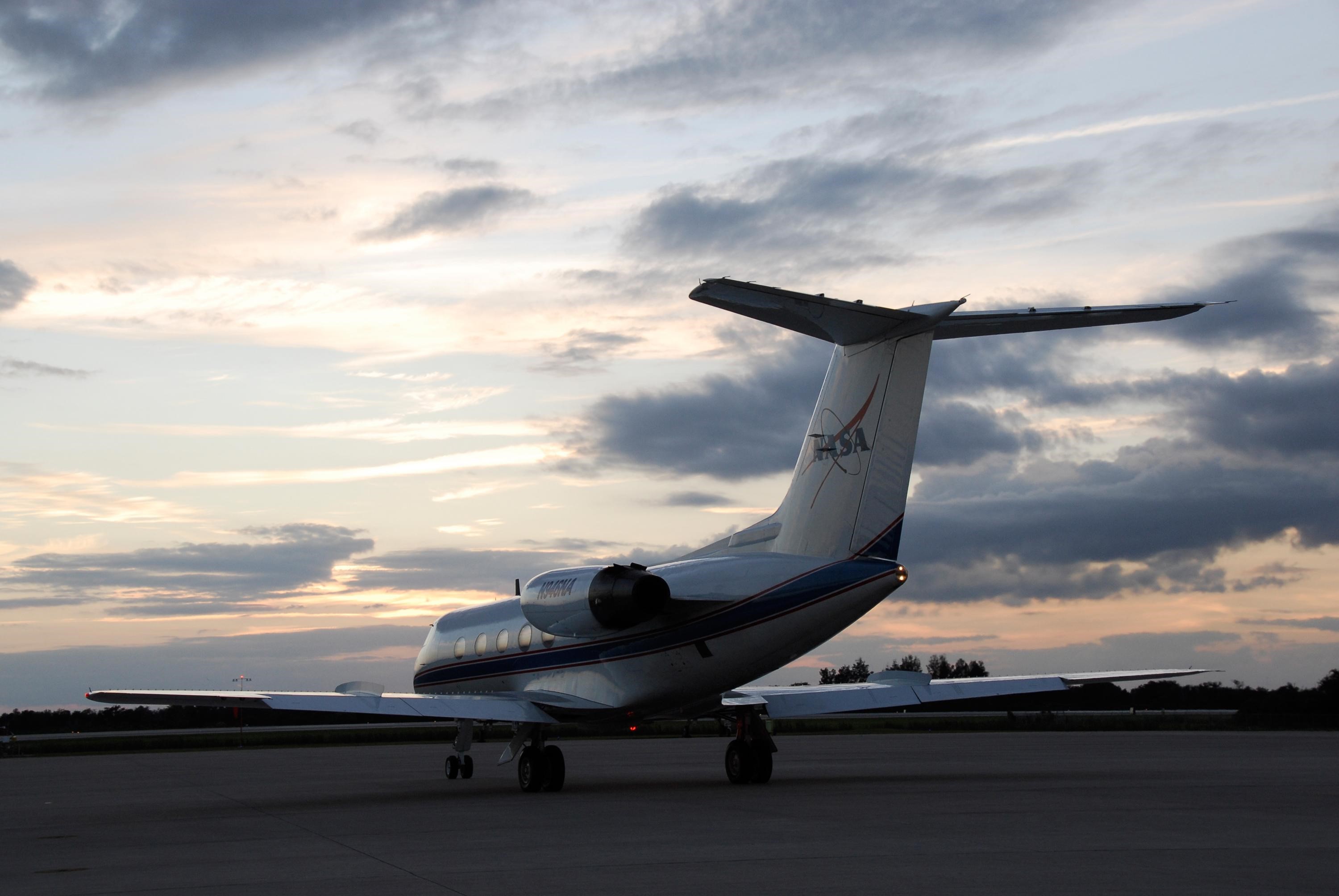 KENNEDY SPACE CENTER, FLA. -- A shuttle training aircraft, or STA, prepares for takeoff from Kennedy Space Center's Shuttle Landing Facility at dusk. The STA is being used for practice flights by space shuttle Atlantis STS-122 Commander Steve Frick and Pilot Alan Poindexter. The STA is a Grumman American Aviation-built Gulf Stream II jet that was modified to simulate an orbiter's cockpit, motion and visual cues, and handling qualities. In flight, the STA duplicates the orbiter's atmospheric descent trajectory from approximately 35,000 feet altitude to landing on a runway. Because the orbiter is unpowered during re-entry and landing, its high-speed glide must be perfectly executed the first time. The training is part of terminal countdown demonstration test, or TCDT, activities. The TCDT provides astronauts and ground crews with equipment familiarization, emergency egress training and a simulated launch countdown. On mission STS-122, Atlantis will deliver the European Space Agency's Columbus module to the International Space Station. Columbus is a multifunctional, pressurized laboratory that will be permanently attached to U.S. Node 2, called Harmony, and will expand the research facilities aboard the station. Launch is targeted for Dec. 6. Photo credit: NASA/Kim Shiflett