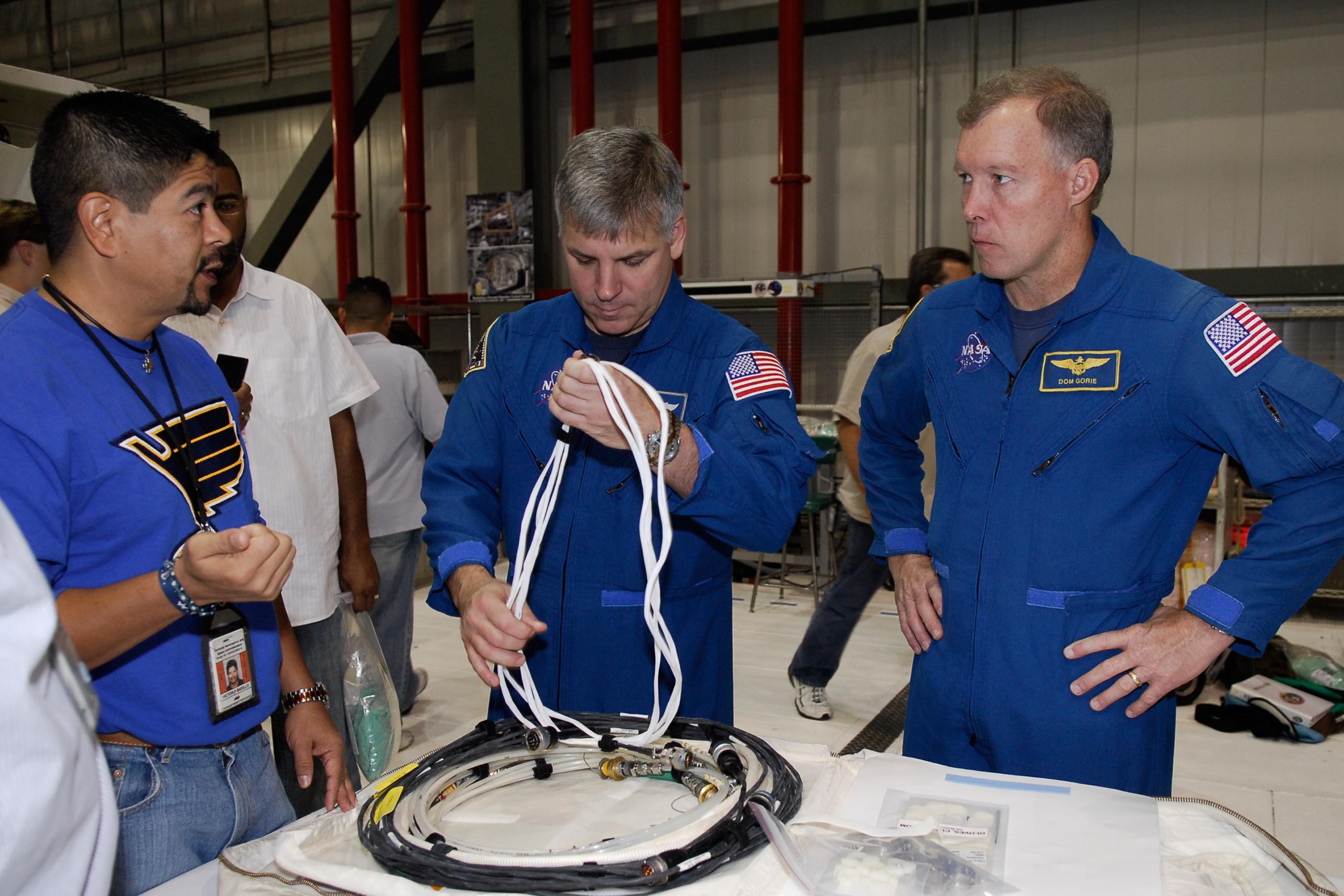 KENNEDY SPACE CENTER, FLA. -- In the Orbiter Processing Facility at NASA's Kennedy Space Center, space shuttle Endeavour's STS-123 Pilot Gregory Johnson (center) handles equipment that will be carried on the mission. At right, Commander Dominic Gorie listens to a technician describing the equipment. The crew is at Kennedy for crew equipment interface test, a process of familiarization with payloads, hardware and the space shuttle. The STS-123 mission is targeted for launch on Feb. 14. It will be the 25th assembly flight of the station. Photo credit: NASA/Kim Shiflett