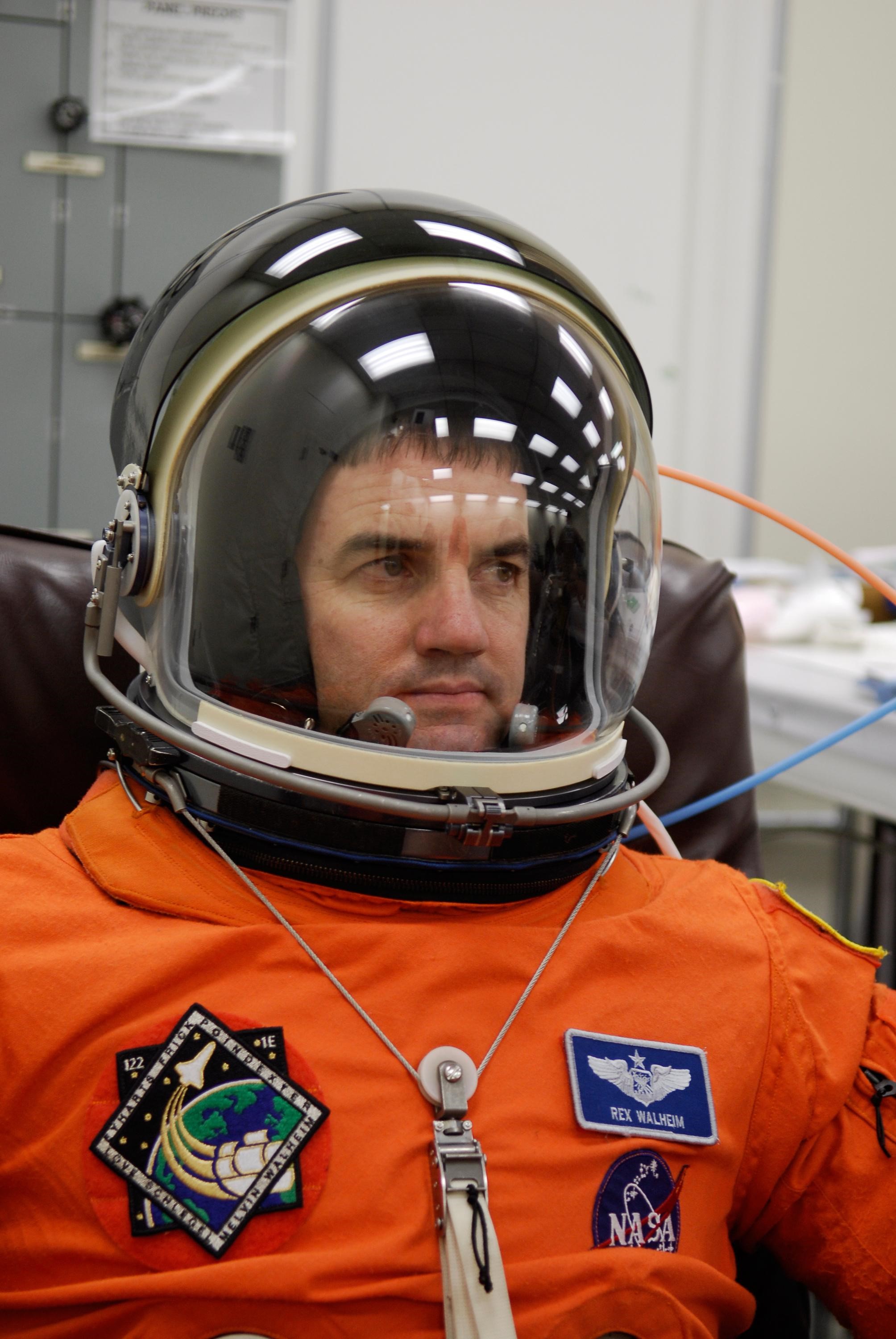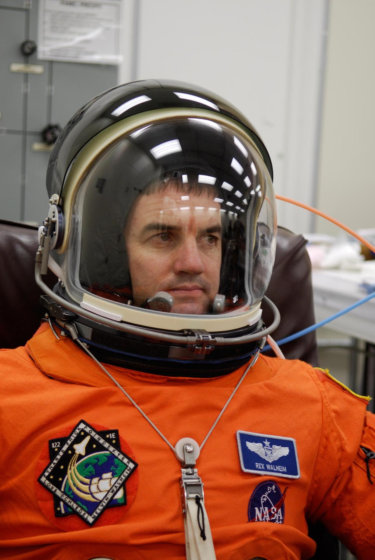 KENNEDY SPACE CENTER, FLA. -- STS-122 Mission Specialist Rex Walheim checks the helmet to his launch and entry suit for a final fitting before space shuttle Atlantis' launch scheduled for 4:31 p.m. EST on Dec. 6. Walheim will make his second shuttle flight. Atlantis will carry the Columbus Lab, Europe’s largest contribution to the construction of the International Space Station. It will support scientific and technological research in a microgravity environment. Columbus, a program of ESA, is a multifunctional, pressurized laboratory that will be permanently attached to Node 2 of the space station to carry out experiments in materials science, fluid physics and biosciences, as well as to perform a number of technological applications. Photo credit: NASA/Kim Shiflett