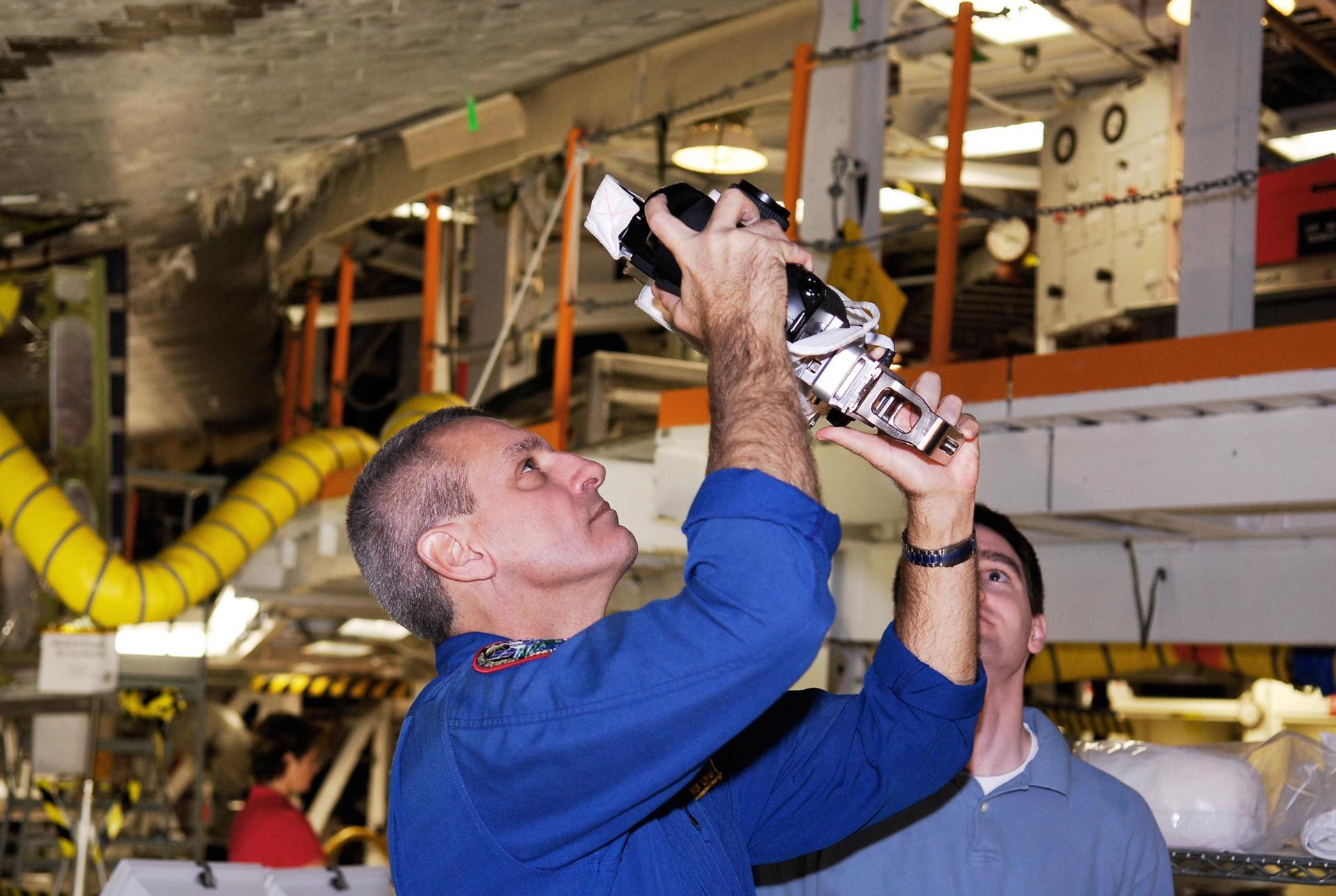 KENNEDY SPACE CENTER, FLA. -- In the Orbiter Processing Facility, STS-123 Mission Specialist Richard Linnehan tries out one of the cameras that will be used on the mission. He and other crew members are at NASA's Kennedy Space Center for a crew equipment interface test, a process of familiarization with payloads, hardware and the space shuttle. The STS-123 mission is targeted for launch on space shuttle Endeavour on Feb. 14. It will be the 25th assembly flight of the station. Photo credit: NASA/Kim Shiflett