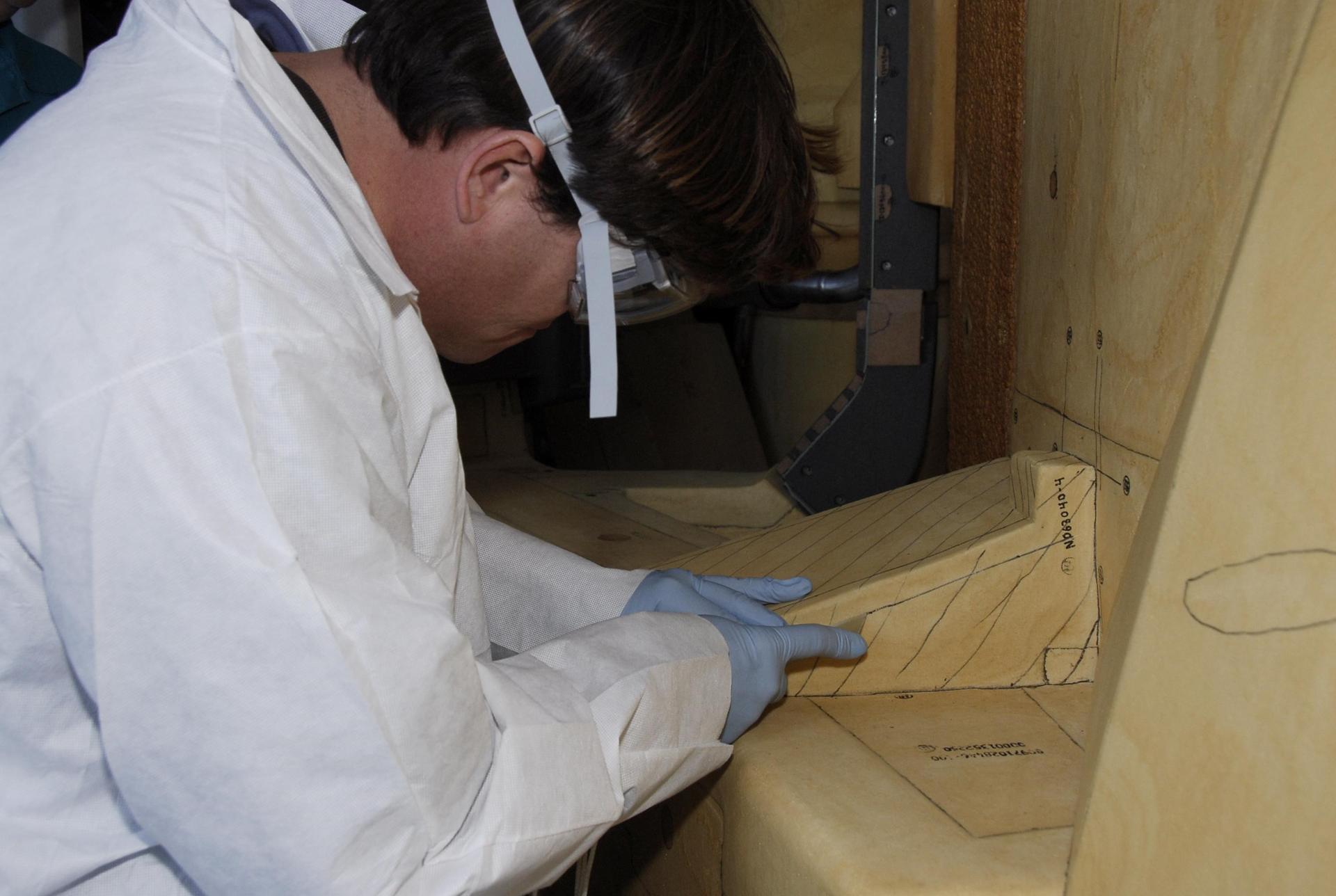 KENNEDY SPACE CENTER, FLA. -- At Launch Pad 39A, a United Space Alliance technician carefully cuts away the foam insulation surrounding the covers over the feed-through connector box on the external tank for space shuttle Atlantis' STS-122 mission. The covers will be removed for access to the feed-through connectors. Following the failure of some of the tank's engine cutoff sensors, or ECO sensors, during propellant tanking for launch attempts on Dec. 6 and Dec. 9, a tanking test was conducted on Dec. 18 to aid in troubleshooting the cause. Technicians spliced test wiring into the ECO sensor electrical system and used time domain reflectometry equipment to help locate the electrical anomaly. Results of the tanking test pointed to an open circuit in the feed-through connector wiring, which is located at the base of the tank. The feed-through connector passes the wires from the inside of the tank to the outside. During the holiday period, workers from Lockheed Martin will begin inspecting and testing the connector. Shuttle program managers will meet on Dec. 27 to review the test and analysis, and decide on a forward plan. Photo credit: NASA/Kim Shiflett