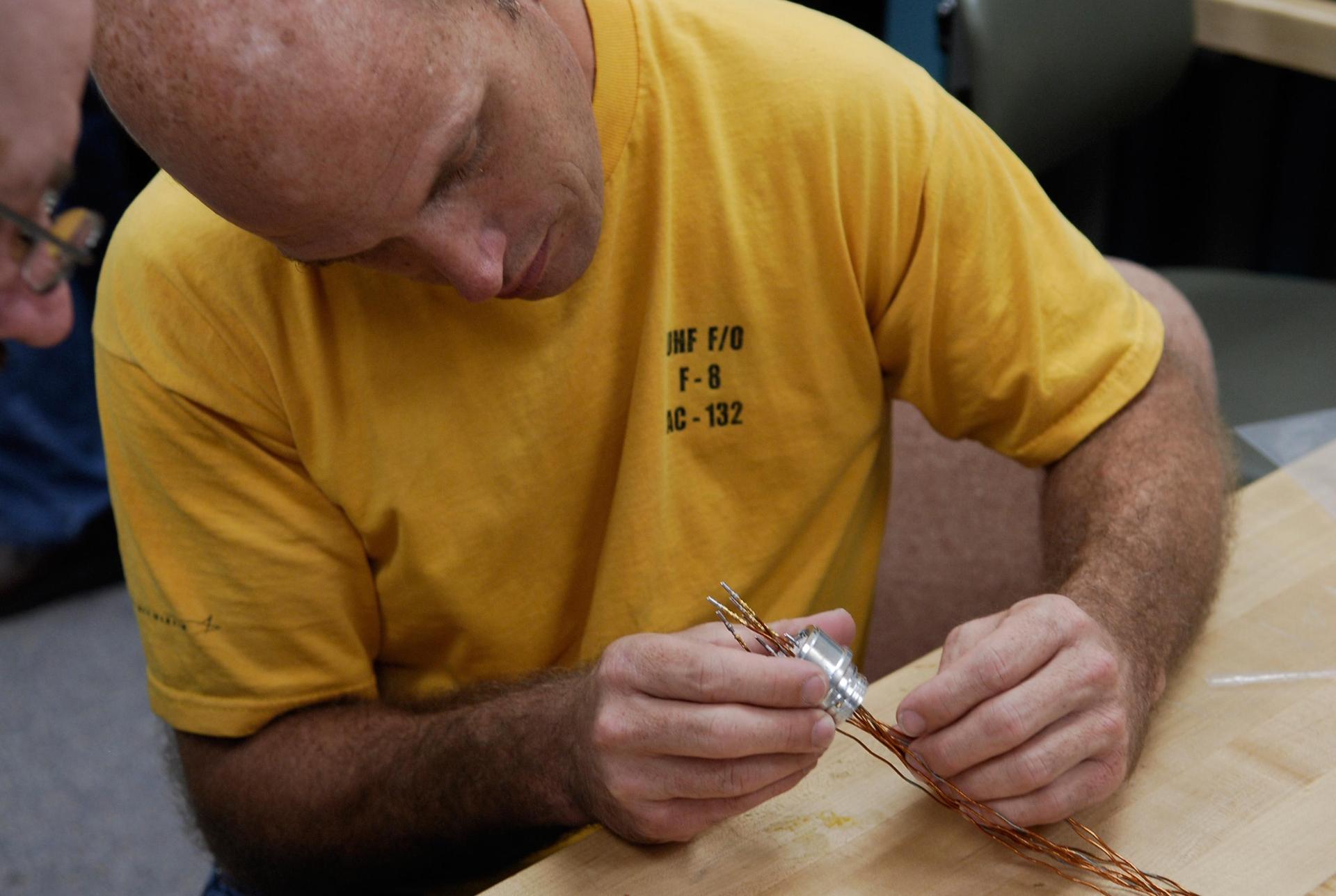 KENNEDY SPACE CENTER, FLA. -- At a lab at NASA's Kennedy Space Center, Kevin Wyckoff, an aerospace technician with the United Launch Alliance, examines an electrical wiring harness. The harness will be inserted into a replacement feed-through connector during preparations to solder the pins to the socket of the connector. The connector will later be installed in the external fuel tank for space shuttle Atlantis' STS-122 mission. The technician performed this exacting task on the Centaur upper stage for Atlas and Titan launches in 1994 and was specifically chosen for the task. Soldering the connector pins and sockets together addresses the most likely cause of a problem in the engine cutoff sensor system, or ECO system. Some of the tank's ECO sensors failed during propellant tanking for launch attempts on Dec. 6 and Dec. 9. Results of a tanking test on Dec. 18 pointed to an open circuit in the feed-through connector wiring, which is located at the base of the tank. The feed-through connector passes the wires from the inside of the tank to the outside. After the soldering is completed and the connector is reinstalled, shuttle program managers will decide on how to proceed. The launch date for mission STS-122 is under review. Photo credit: NASA/Kim Shiflett