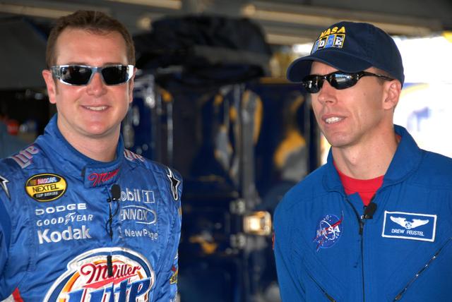KENNEDY SPACE CENTER, FLA. -- Astronaut Andrew Feustel (right) is ready to participate in NASCAR's Preseason Thunder Fan Fest at Daytona International Speedway. At left is NASCAR driver Kurt Busch. Feustel's appearance celebrates NASA's 50th anniversary and the speedway's 50th running of the Daytona 500 in February. Besides meeting with fans and media, Feustel will ride around the track, taking "hot laps," in an official track vehicle. The NASA/NASCAR association spans decades. Technology developed for the space program has helped NASCAR drivers increase their performance and stay safe over the years. They wear cooling suits similar to what astronauts wear during a spacewalk. Foam that NASA developed for aircraft seats protects racecar drivers' necks in crashes. In addition to participating in the fan festival, NASA will fly three Daytona 500 flags aboard an upcoming space shuttle flight. Speedway officials plan to wave one of the flags to begin the 2008 installment of the Daytona 500, while another will be presented to the winning driver. NASA will keep the third. Feustel will fly on the space shuttle mission STS-125 to the Hubble Space Telescope. The mission will extend and improve the observatory's capabilities through 2013. Launch is targeted for August 2008. Photo credit: NASA/George Shelton
