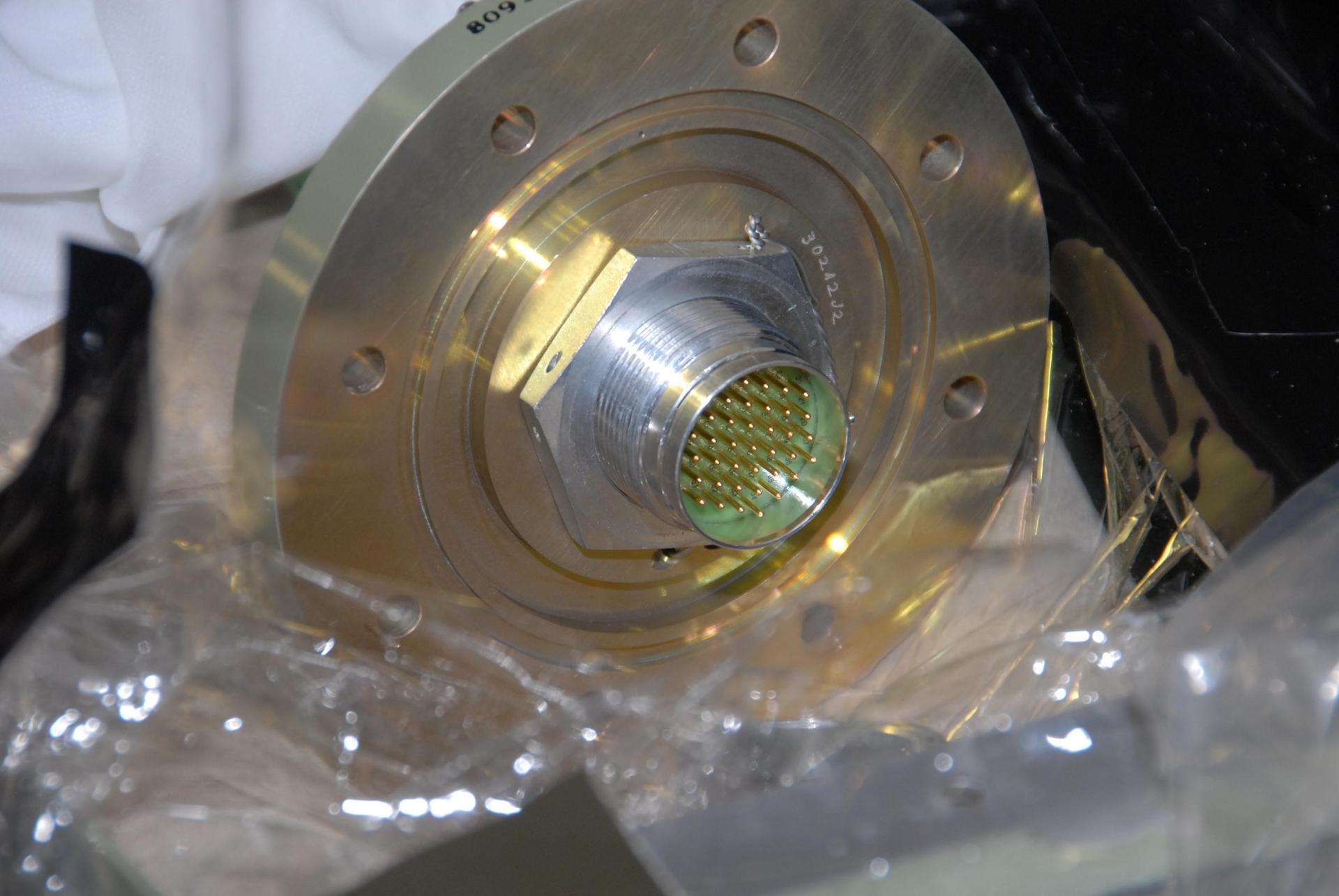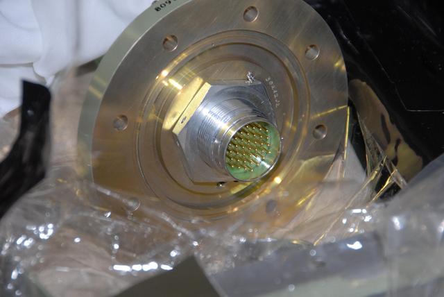 KENNEDY SPACE CENTER, FLA. -- This closeup of the replacement feed-through connector for the engine cutoff, or ECO, sensor system on space shuttle Atlantis shows the pins that were soldered at Kennedy. The feed-through connector passes the wires from the inside of the tank to the outside. Results of a tanking test on Dec. 18 pointed to an open circuit in the feed-through connector wiring, which is located at the base of the tank. The pins in the replacement connector have been precisely soldered to create a connection that allows sensors inside the tank to send signals to the computers onboard Atlantis. The work is being done on Launch Pad 39A. Space shuttle Atlantis is now targeted for launch on Feb. 7. Photo credit: NASA/George Shelton