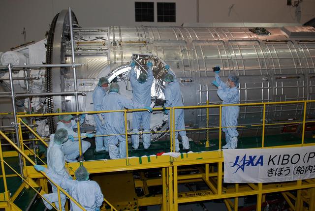 KENNEDY SPACE CENTER, FLA. -- In the Space Station Processing Facility at NASA's Kennedy Space Center, members of the STS-124 crew look over the scientific airlock in the Kibo pressurized module. The module is part of the payload for the mission, targeted for launch no earlier than April 24. The crew comprises seven: Commander Mark Kelly, Pilot Kenneth Ham, and Mission Specialists Karen Nyberg, Ronald Garan, Michael Fossum and Akihiko Hoshide. The crew is at Kennedy for a crew equipment interface test that includes familiarization with tools and equipment that will be used on the mission. The STS-124 mission is the second of three flights that will launch components to complete the Japanese pressurized module, the Kibo laboratory. The mission will include two spacewalks to install the new lab and its remote manipulator system. The lab's logistics module, which will have been installed in a temporary location during STS-123, will be attached to the new lab. Photo credit: NASA/Kim Shiflett