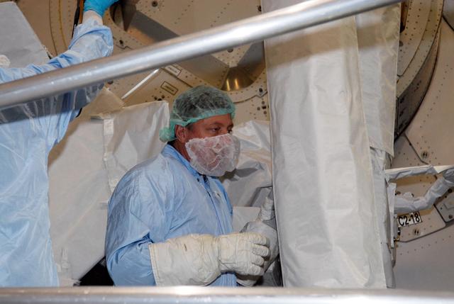 KENNEDY SPACE CENTER, FLA. -- In the Space Station Processing Facility at NASA's Kennedy Space Center, STS-124 Mission Specialist Michael Fossum gets a close look at the Remote Manipulator System, or RMS, two robotic arms that support operations on the outside of the Japanese Experiment Module, called Kibo. They will be used to exchange experiment payloads or hardware located on the Exposed Facility and Experiment Logistics Module - Exposed Section and from inside the pressurized module through a scientific airlock, support maintenance tasks of Kibo and handle orbital replacement units. Crew members are at Kennedy for a crew equipment interface test that includes familiarization with tools and equipment that will be used on the mission. The STS-124 mission is the second of three flights that will launch components to complete the Japanese pressurized module, the Kibo laboratory. The mission will include two spacewalks to install the new lab and its remote manipulator system. The lab's logistics module, which will have been installed in a temporary location during STS-123, will be attached to the new lab. Photo credit: NASA/Kim Shiflett