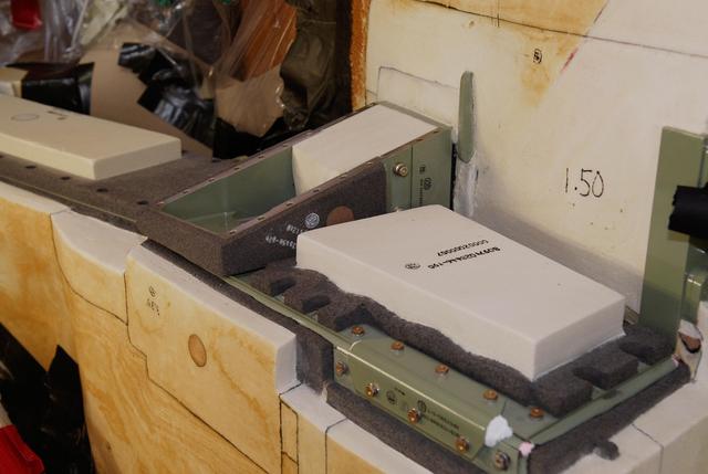 KENNEDY SPACE CENTER, FLA. -- On Launch Pad 39A at NASA's Kennedy Space Center, foam is being replaced around the engine cutoff, or ECO, sensor system connector and wiring on space shuttle Atlantis' external tank. The foam was removed to enable engineers to remove and replace a feed-through ECO sensor connector on the tank. The feed-through connector passes the wires from the inside of the tank to the outside. Results of a tanking test on Dec. 18 pointed to an open circuit in the feed-through connector wiring, which is located at the base of the tank. The pins in the replacement connector were precisely soldered to create a connection that allows sensors inside the tank to send signals to the computers onboard Atlantis. The launch date for the shuttle's STS-122 mission has now been targeted for Feb. 7. Photo credit: NASA/Kim Shiflett
