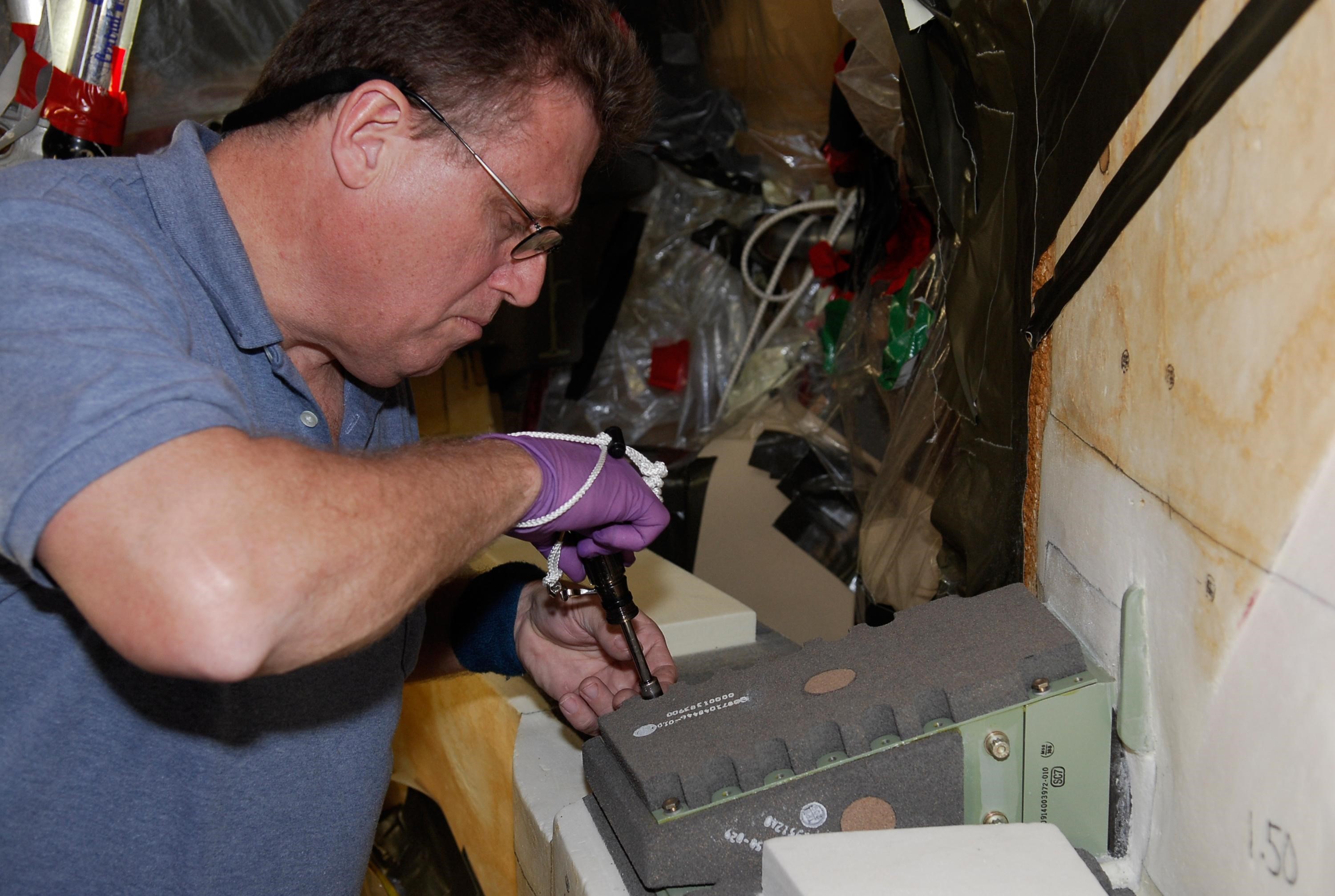 KENNEDY SPACE CENTER, FLA. -- On Launch Pad 39A at NASA's Kennedy Space Center, a technician attaches the cover over the engine cutoff, or ECO, sensor system connector and wiring on space shuttle Atlantis' external tank. The feed-through connector passes the wires from the inside of the tank to the outside. Results of a tanking test on Dec. 18 pointed to an open circuit in the feed-through connector wiring, which is located at the base of the tank. The pins in the replacement connector were precisely soldered to create a connection that allows sensors inside the tank to send signals to the computers onboard Atlantis. The launch date for the shuttle's STS-122 mission has now been targeted for Feb. 7. Photo credit: NASA/Kim Shiflett