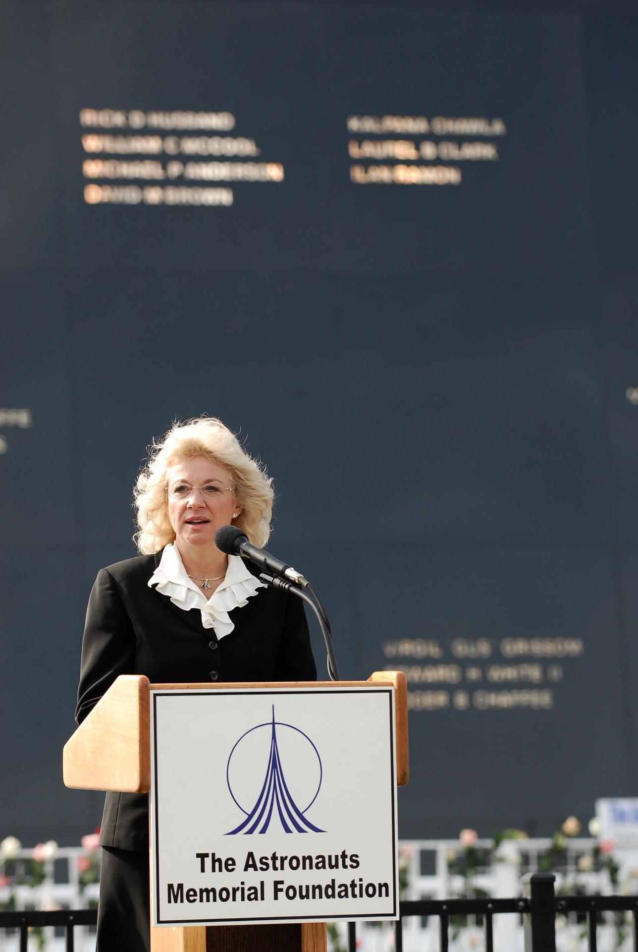KENNEDY SPACE CENTER, FLA. -- At a special commemorative service to honor NASA's fallen heroes, Evelyn Husband-Thompson, widow of shuttle commander Rick Husband on mission STS-107, shares her memories of the day the space shuttle Columbia was lost as it returned from the mission. Husband-Thompson stands in front of the Space Mirror Memorial at NASA's Kennedy Space Center Visitor Complex. Kennedy marked the NASA Day of Remembrance with special ceremonies. This year the crew of Columbia was remembered in a special way on the day that marked the fifth anniversary of the Columbia accident. Photo credit: NASA/Kim Shiflett