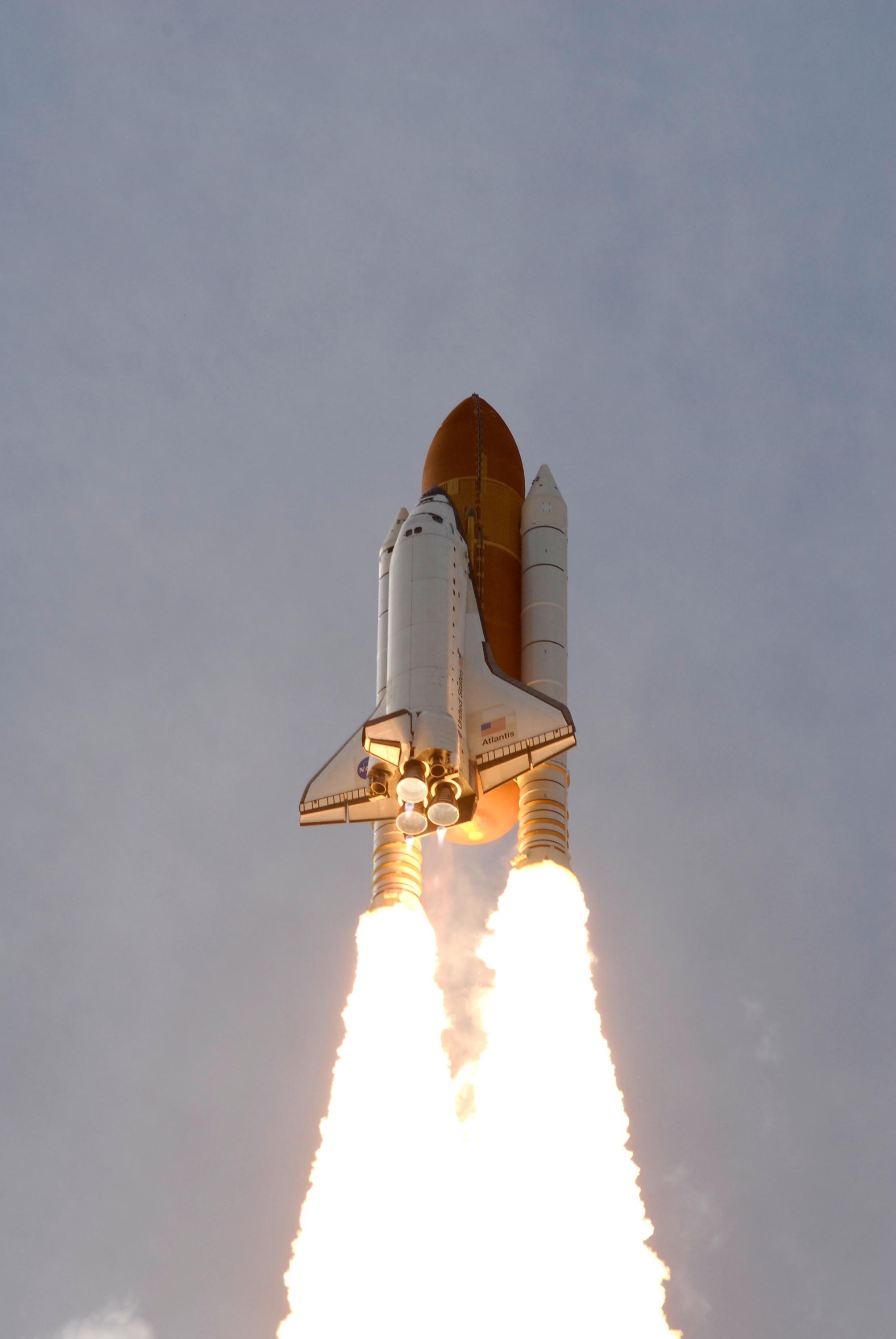 KENNEDY SPACE CENTER, FLA. -- Twin columns of fire help propel space shuttle Atlantis into space on mission STS-122 to the International Space Station. Liftoff was on time at 2:45 p.m. EST. Below the nozzles of the main engines are the blue cones of light, known as shock or mach diamonds. They are a formation of shock waves in the exhaust plume of an aerospace propulsion system. The launch is the third attempt for Atlantis since December 2007 to carry the European Space Agency's Columbus laboratory to the International Space Station. During the 11-day mission, the crew's prime objective is to attach the laboratory to the Harmony module, adding to the station's size and capabilities. Photo credit: NASA/Jerry Cannon, Rusty Backer