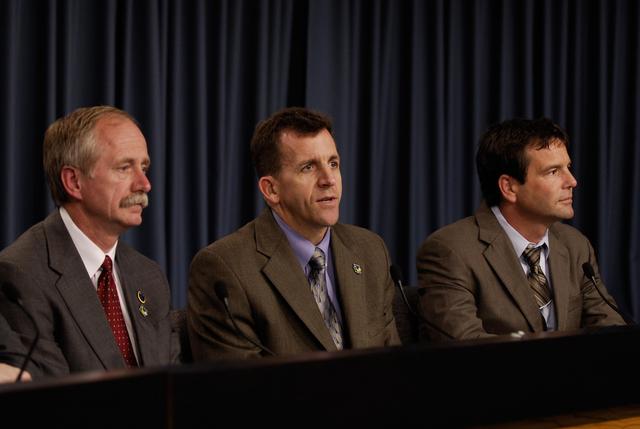 KENNEDY SPACE CENTER, FLA. -- Following the successful launch of space shuttle Atlantis on mission STS-122, NASA VIPs appear at a news conference to give their views about the launch and mission. Seen here are Associate Administrator for Space Operations Bill Gerstenmaier, Director of Mission Launch Integration LeRoy Cain and STS-122 Launch Director Doug Lyons. Also on the dais but not pictured are NASA Administrator Michael Griffin and European Space Agency Director General Jean-Jacques Dordain. During the 11-day mission, the crew's prime objective is to attach the Columbus laboratory to the Harmony module, adding to the station's size and capabilities. Photo credit: NASA/Kim Shiflett