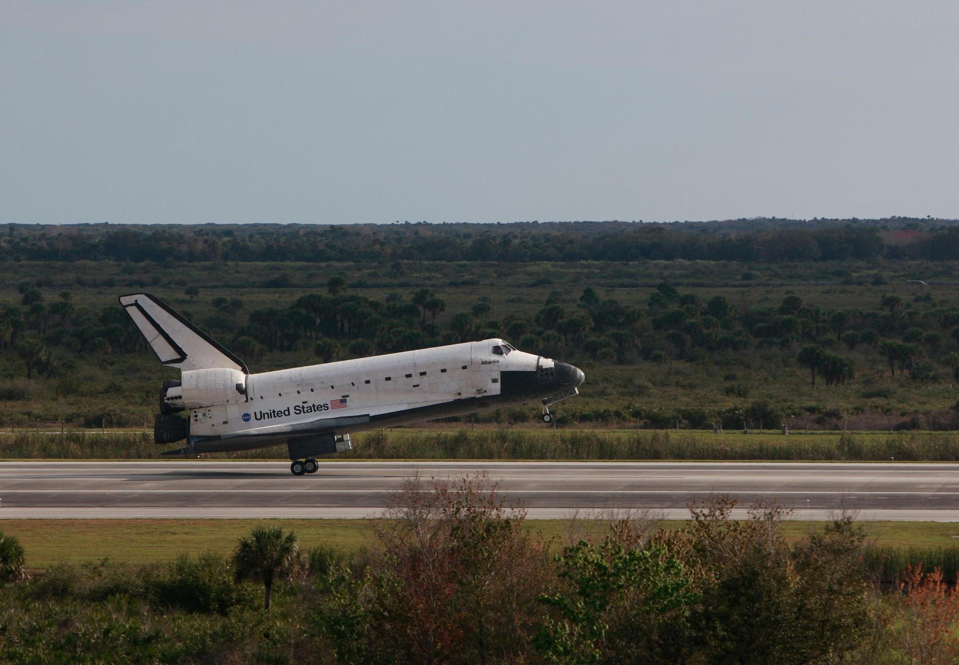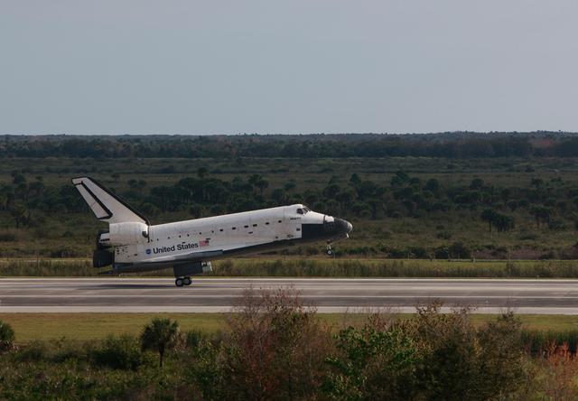 KENNEDY SPACE CENTER, FLA. -- Space shuttle Atlantis touches down on Runway 15 of the Shuttle Landing Facility at NASA's Kennedy Space Center after a nearly 5.3 million mile round trip to the International Space Station. The shuttle landed on orbit 202 to complete the 13-day STS-122 mission. Main gear touchdown was 9:07:10 a.m. Nose gear touchdown was 9:07:20 a.m. Wheel stop was at 9:08:08 a.m. Mission elapsed time was 12 days, 18 hours, 21 minutes and 44 seconds. During the mission, Atlantis' crew installed the new Columbus laboratory, leaving a larger space station and one with increased science capabilities. The Columbus Research Module adds nearly 1,000 cubic feet of habitable volume and affords room for 10 experiment racks, each an independent science lab. Photo courtesy of Scott Andrews