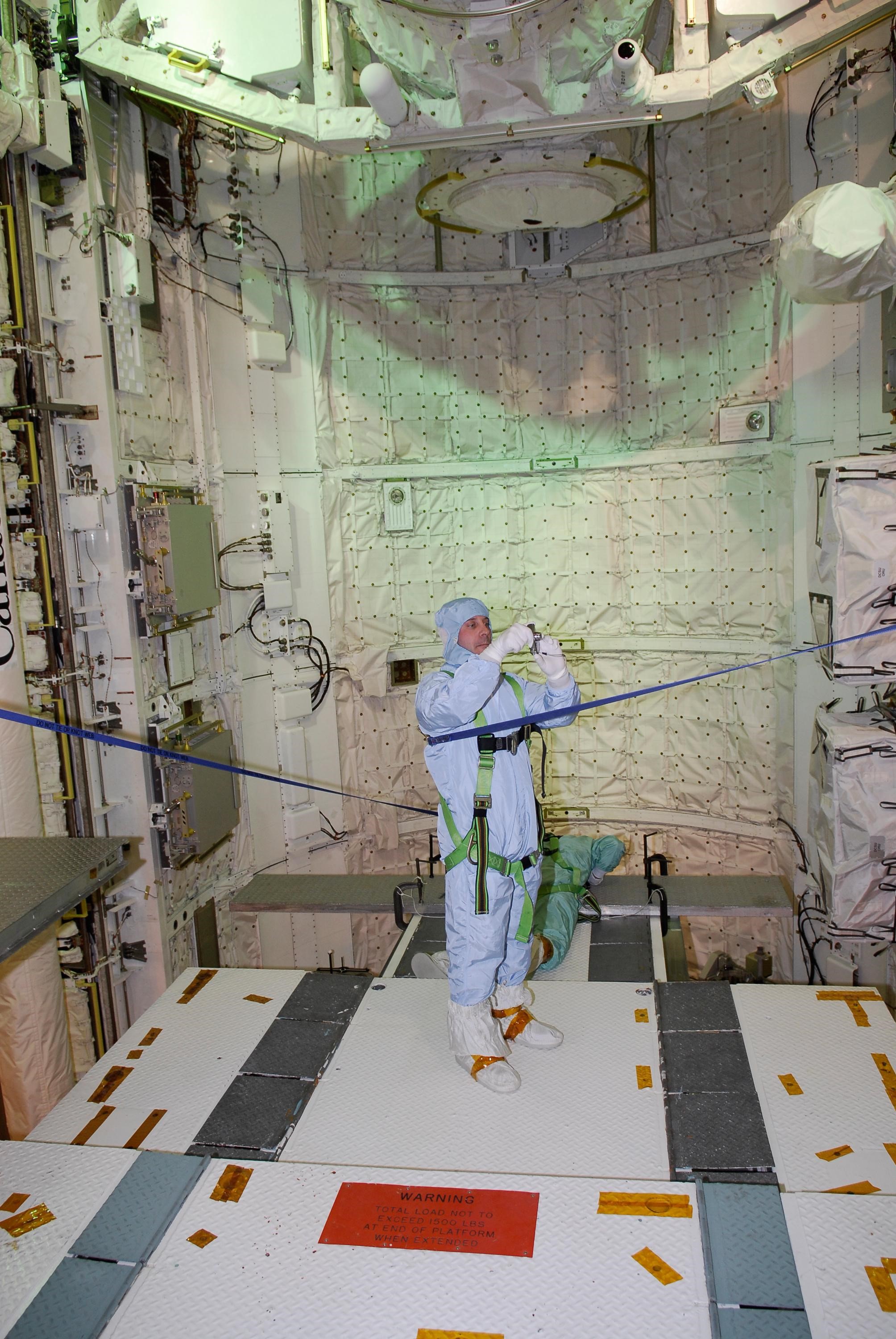 KENNEDY SPACE CENTER, FLA. -- On NASA Kennedy Space Center's Launch Pad 39A, STS-123 Mission Specialist Rick Linnehan photographs some of the payload in space shuttle Endeavour's payload bay. He and other STS-123 crew members are at Kennedy for a full launch dress rehearsal, known as the terminal countdown demonstration test, or TCDT. The TCDT provides astronauts and ground crews with an opportunity to participate in various simulated countdown activities, including equipment familiarization and emergency training. Endeavour is targeted to launch March 11 at 2:28 a.m. EDT on the 16-day STS-123 mission to the International Space Station. Endeavour and its crew will deliver the first section of the Japan Aerospace Exploration Agency's Kibo laboratory and the Canadian Space Agency's two-armed robotic system, Dextre. Photo credit: NASA/Kim Shiflett