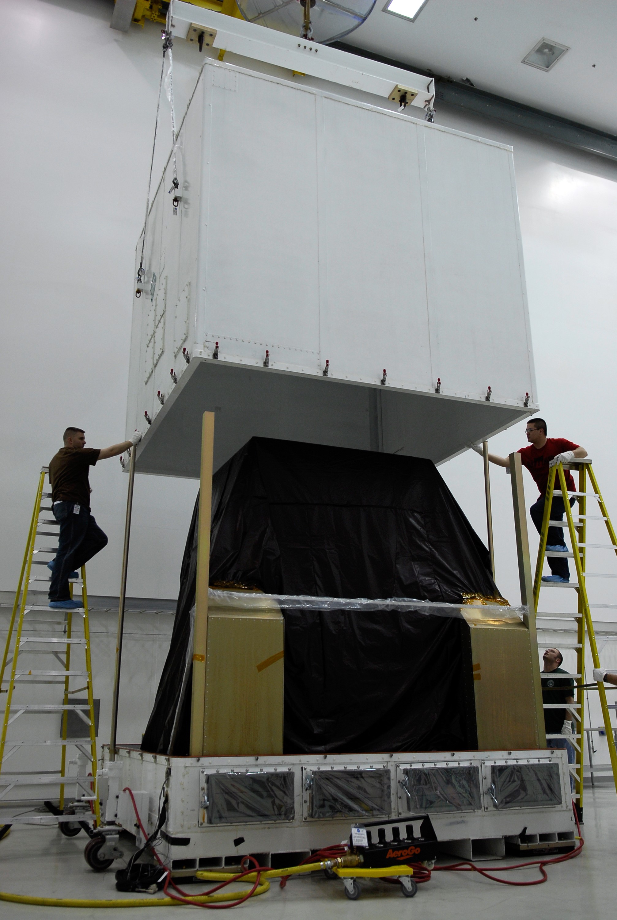 KENNEDY SPACE CENTER, FLA. -- In the Astrotech payload processing facility near the Kennedy Space Center, the shipping container covering NASA's Gamma-Ray Large Area Space Telescope, or GLAST, is lifted to reveal the protected equipment inside. Workers will prepare for a complete checkout of the telescope's scientific instruments. The GLAST will launch aboard a Delta II rocket May 16 from Launch Pad 17-B on Cape Canaveral Air Force Station. A powerful space observatory, the GLAST will explore the most extreme environments in the universe, and answer questions about supermassive black hole systems, pulsars and the origin of cosmic rays. It also will study the mystery of powerful explosions known as gamma-ray bursts. Photo credit: NASA/Kim Shiflett