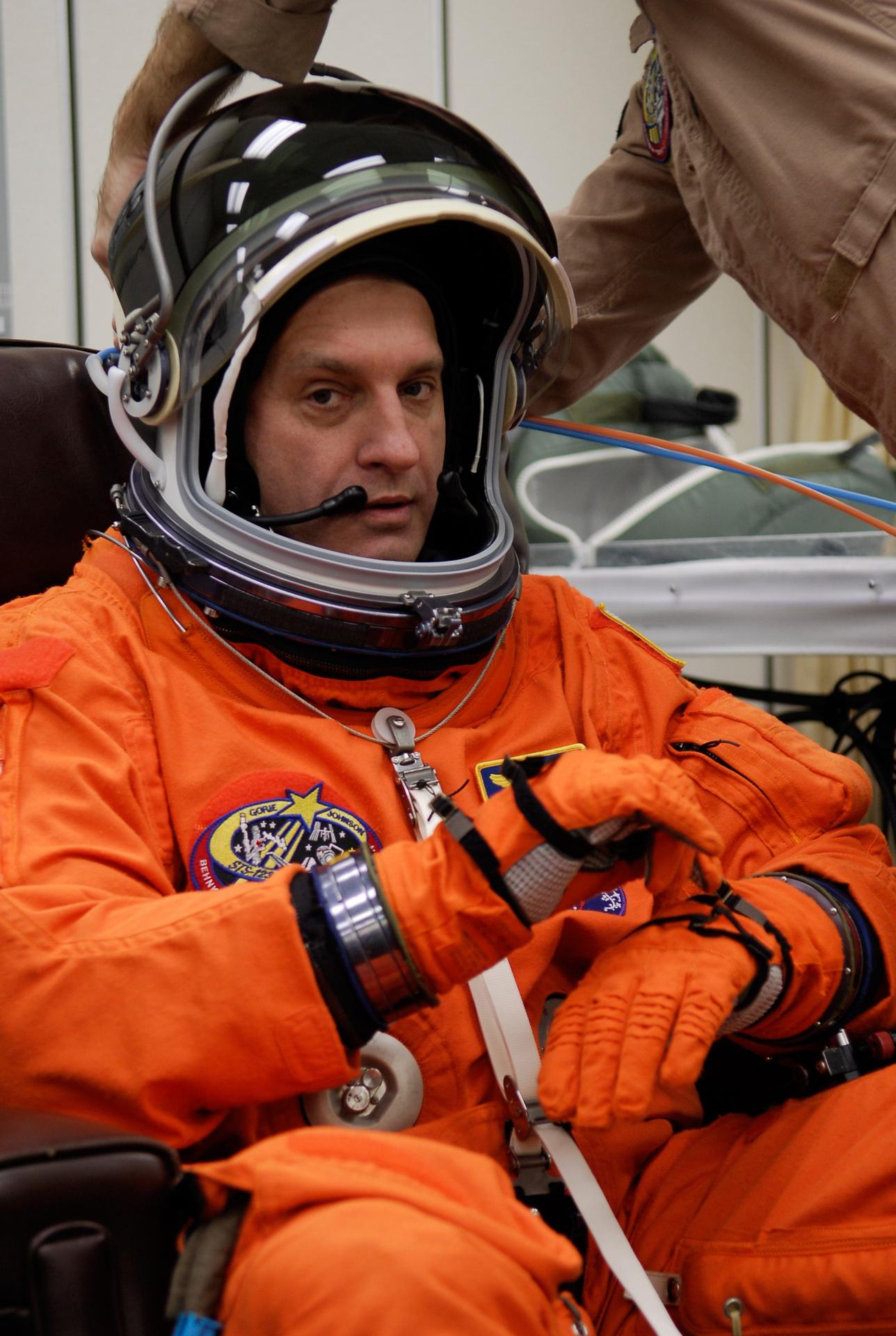 KENNEDY SPACE CENTER, FLA. -- STS-123 Mission Specialist Rick Linnehan adjusts his gloves during suitup for launch on space shuttle Endeavour. The crew will make a record-breaking 16-day mission to the International Space Station. On STS-123, Endeavour and its crew will deliver the first section of the Japan Aerospace Exploration Agency's Kibo laboratory and the Canadian Space Agency's two-armed robotic system, Dextre. Launch is scheduled for 2:28 a.m. EDT March 11. Photo credit: NASA/Kim Shiflett