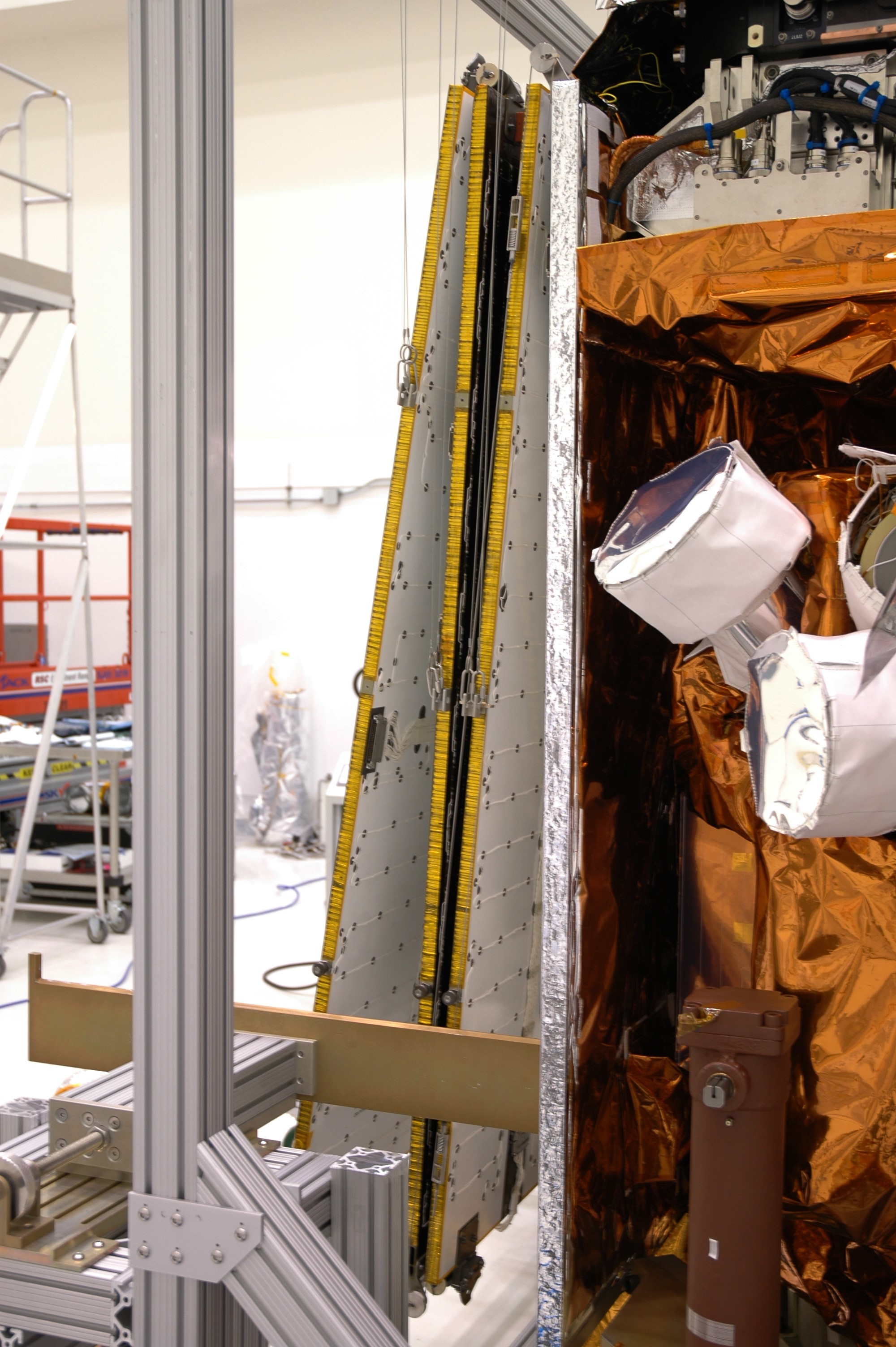 CAPE CANAVERAL, Fla. --- In the Astrotech payload processing facility, the mechanism on NASA's Gamma-Ray Large Area Space Telescope, or GLAST, solar arrays has been released. The telescope will launch aboard a Delta II rocket May 16 from Launch Pad 17-B on Cape Canaveral Air Force Station. A powerful space observatory, the GLAST will explore the most extreme environments in the universe, and answer questions about supermassive black hole systems, pulsars and the origin of cosmic rays. It also will study the mystery of powerful explosions known as gamma-ray bursts. Photo credit: NASA/Jim Grossmann