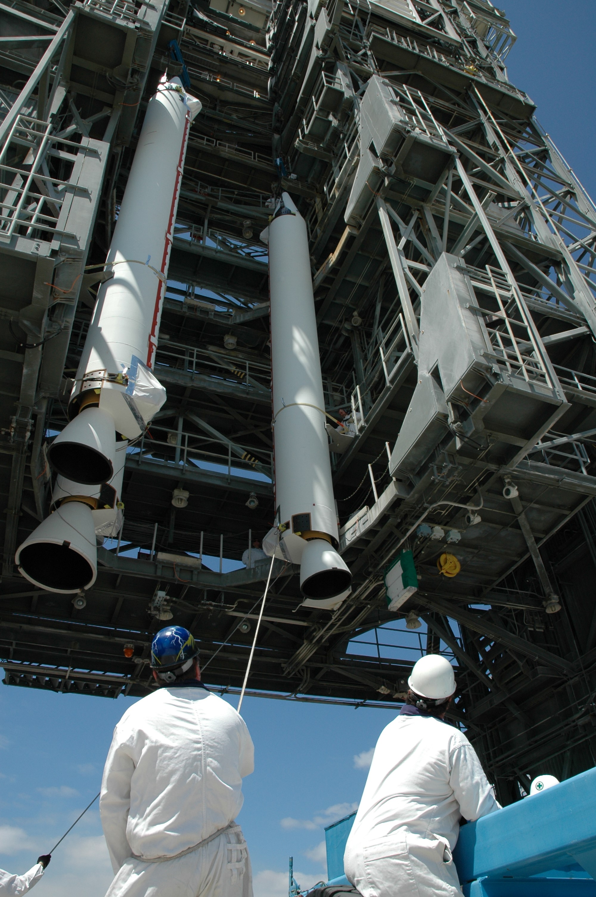 CAPE CANAVERAL, Fla. --- On Pad 17-B on Cape Canaveral Air Force Station, the third solid rocket booster joins two others in the mobile service tower. They will be mated with the Delta II rocket that will launch NASA's Gamma-ray Large Area Space Telescope, or GLAST, spacecraft. A series of nine strap-on solid rocket motors will help power the first stage. Because the Delta rocket is configured as a Delta II 7920 Heavy, the boosters are larger than those used on the standard configuration. The GLAST is a powerful space observatory that will explore the Universe's ultimate frontier, where nature harnesses forces and energies far beyond anything possible on Earth; probe some of science's deepest questions, such as what our Universe is made of, and search for new laws of physics; explain how black holes accelerate jets of material to nearly light speed; and help crack the mystery of stupendously powerful explosions known as gamma-ray bursts. Launch is currently planned for May 16 from Pad 17-B. Photo credit: NASA/Jim Grossmann