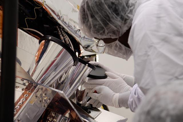 CAPE CANAVERAL, Fla. -- At the Astrotech payload processing facility in Titusville, Fla., a worker adjusts the star tracker sun shade installed on NASA's Gamma-ray Large Area Space Telescope, or GLAST, spacecraft. The GLAST is a powerful space observatory that will explore the Universe's ultimate frontier, where nature harnesses forces and energies far beyond anything possible on Earth; probe some of science's deepest questions, such as what our Universe is made of, and search for new laws of physics; explain how black holes accelerate jets of material to nearly light speed; and help crack the mystery of stupendously powerful explosions known as gamma-ray bursts. A launch date is still to be determined. Photo credit: NASA/Kim Shiflett