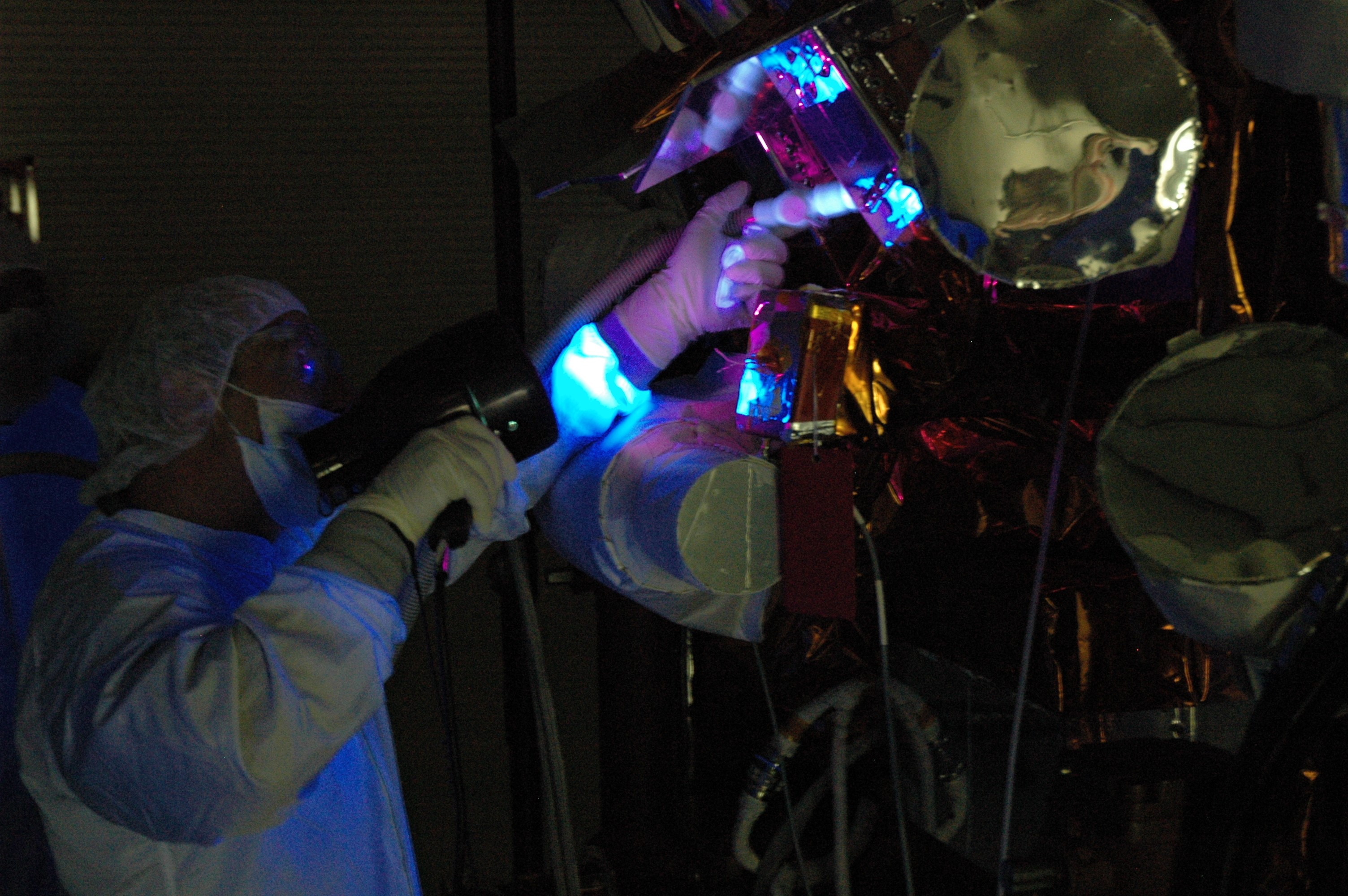 CAPE CANAVERAL, Fla. – At the Astrotech payload processing facility, technicians conduct black light inspection on NASA's Gamma-ray Large Area Space Telescope, or GLAST, spacecraft. The GLAST is a powerful space observatory that will explore the Universe's ultimate frontier, where nature harnesses forces and energies far beyond anything possible on Earth; probe some of science's deepest questions, such as what our Universe is made of, and search for new laws of physics; explain how black holes accelerate jets of material to nearly light speed; and help crack the mystery of stupendously powerful explosions known as gamma-ray bursts. A launch date is still to be determined. Photo credit: NASA/Jim Grossmann