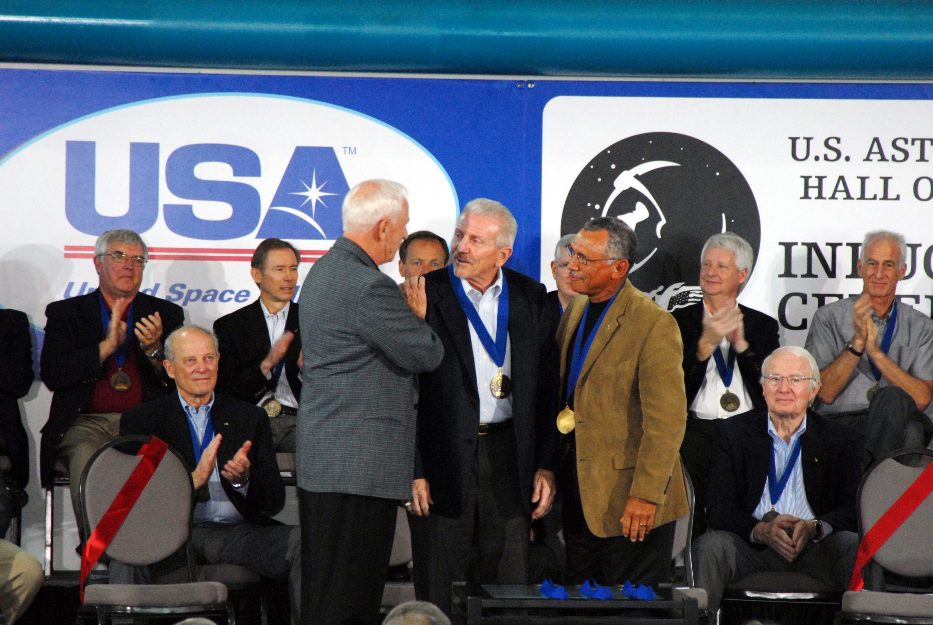 CAPE CANAVERAL, Fla. -- Former astronaut Loren Shriver (center) is inducted into the U.S. Astronaut Hall of Fame May 3 at NASA's Kennedy Space Center. Presenting the medal are former inductees Al Worden (left) and Charles Bolden (right). Other inductees were John Blaha; Bryan O'Connor, NASA's chief of Safety and Mission Assurance at NASA Headquarters in Washington; and Bob Cabana, center director of NASA's Stennis Space Center in Mississippi. Other former astronauts attending included Scott Carpenter, John Young, Bob Crippen, and Walt Cunningham. The U.S. Astronaut Hall of Fame is operated by Kennedy Space Center Visitor Complex on behalf of NASA. CNN correspondent John Zarrella hosted the event.