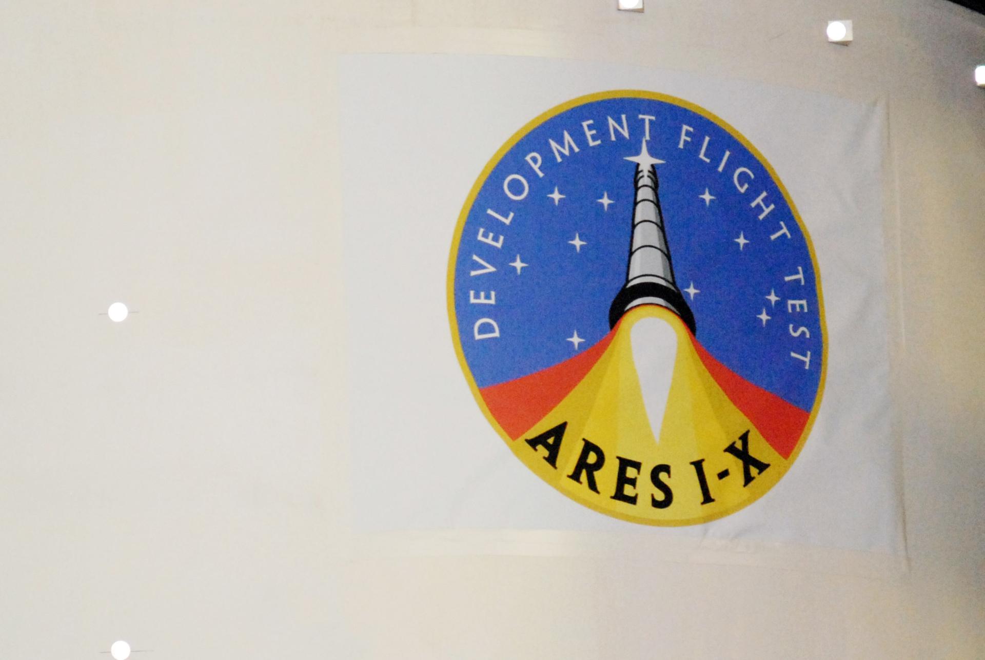 CAPE CANAVERAL, Fla. -- Vibration and laser testing is being conducted on Ares I-X segments at NASA's Kennedy Space Center. Here, is a closeup of a special Ares I-X Logo, supplied by Jon Cowart of NASA Constellation, that the Inert Solid Rocket Motor Segment has received for the Modal Test. Photo credit: NASA/Dimitri Gerondidakis