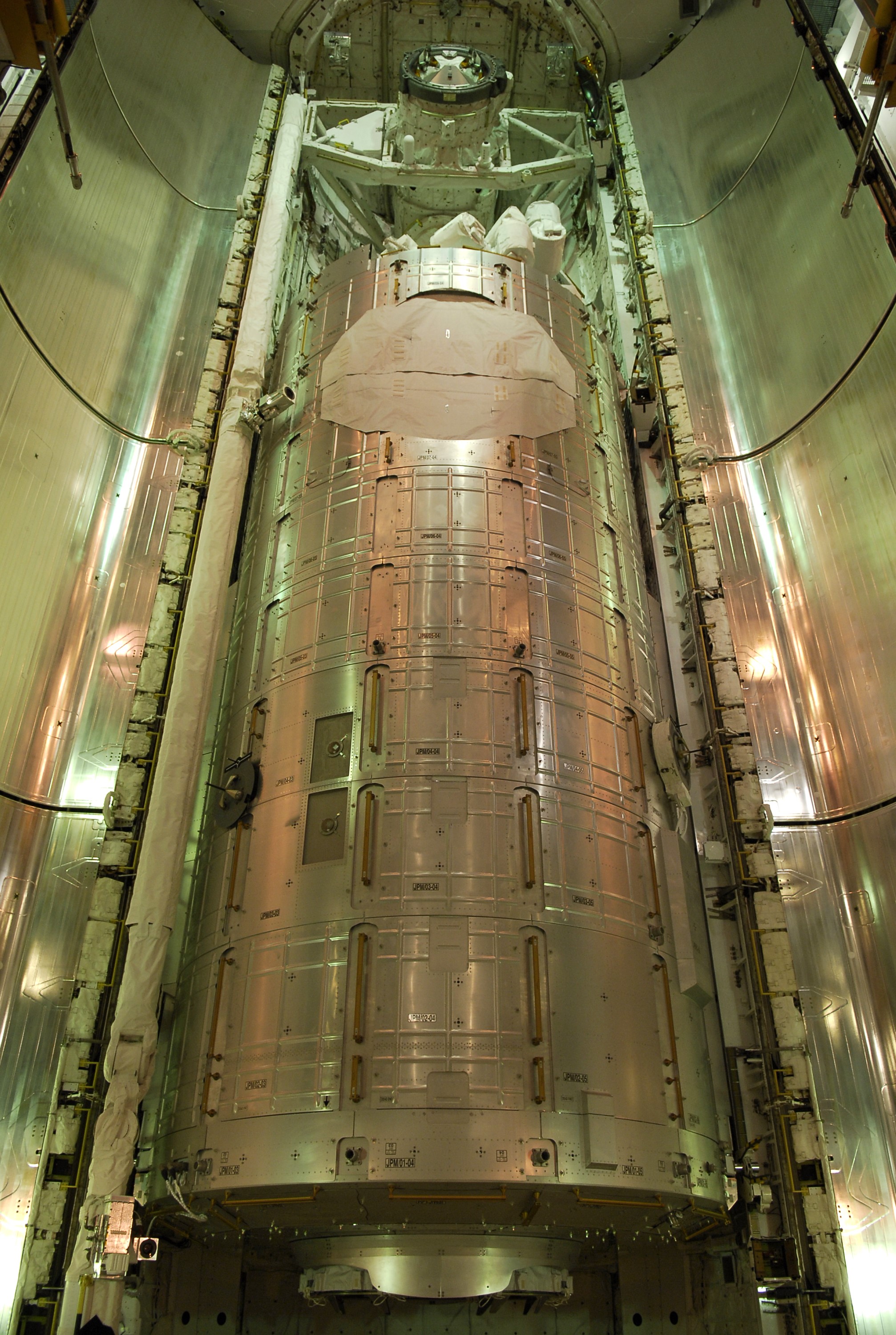 CAPE CANAVERAL, Fla. -- On Launch Pad 39A at NASA's Kennedy Space Center, the Japanese Experiment Module—Pressurized Module is seen in space shuttle Discovery's payload bay as the payload bay doors begin to close. Above the pressurized module is the orbital docking system. The launch of Discovery on its STS-124 mission is targeted for May 31. On the mission, Discovery will transport the pressurized module and the Japanese Remote Manipulator System to the International Space Station. Photo credit: NASA/Kim Shiflett