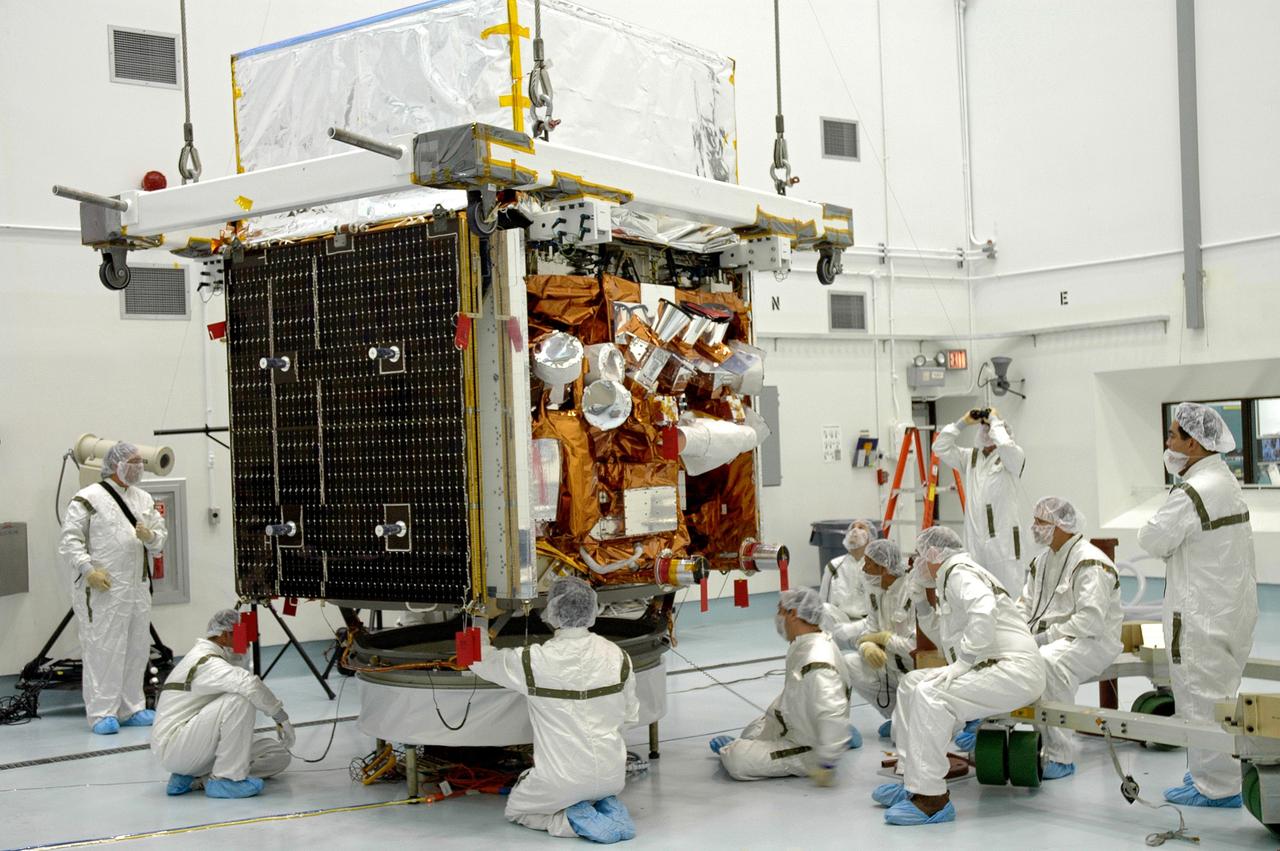 CAPE CANAVERAL, Fla. -- At the Astrotech payload processing facility, technicians check the attachment of NASA's Gamma-Ray Large Area Space Telescope, or GLAST, spacecraft on the payload attach fitting. The fitting will eventually be used to mate GLAST to the Delta II launch vehicle. The GLAST is a powerful space observatory that will explore the Universe's ultimate frontier, where nature harnesses forces and energies far beyond anything possible on Earth; probe some of science's deepest questions, such as what our Universe is made of, and search for new laws of physics; explain how black holes accelerate jets of material to nearly light speed; and help crack the mystery of stupendously powerful explosions known as gamma-ray bursts. A launch date still is to be determined. Photo credit: NASA/Jim Grossmann