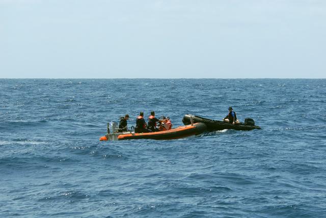 CAPE CANAVERAL, Fla. -- Support boats connect off Florida's central east coast during a rescue training exercise, known as Mode VIII. In support of, and with logistical support from, NASA, USSTRATCOM is hosting a major exercise involving Department of Defense, Department of Homeland Security, search and rescue (SAR) forces, including the 45th Space Wing at Patrick Air Force Base, which support space shuttle astronaut bailout contingency operations, known as Mode VIII. This exercise tests SAR capabilities to locate, recover and provide medical treatment for astronauts following a space shuttle launch phase open-ocean bailout. Participants include members of the U.S. Navy, U.S. Coast Guard, U.S. Air Force, and NASA's Kennedy Space Center and Johnson Space Center. Photo credit: NASA/Dimitri Gerondidakis