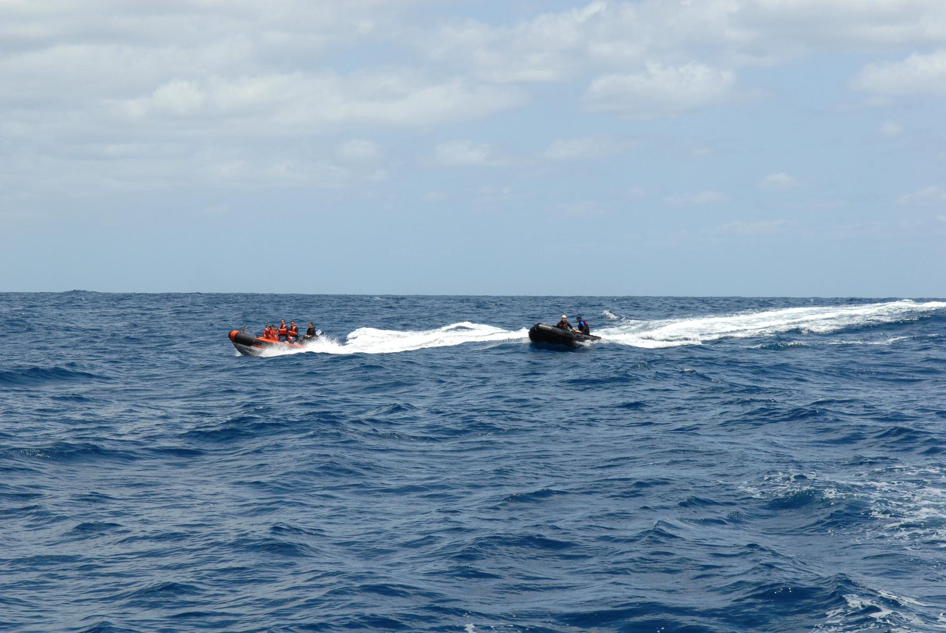 CAPE CANAVERAL, Fla. -- Off Florida's central east coast, support boats from a training exercise, known as Mode VIII, return to the U.S. Coast Guard cutter Kingfisher, from Port Canaveral, Fla. In support of, and with logistical support from, NASA, USSTRATCOM is hosting a major exercise involving Department of Defense, Department of Homeland Security, search and rescue (SAR) forces, including the 45th Space Wing at Patrick Air Force Base, which support space shuttle astronaut bailout contingency operations, known as Mode VIII. This exercise tests SAR capabilities to locate, recover and provide medical treatment for astronauts following a space shuttle launch phase open-ocean bailout. Participants include members of the U.S. Navy, U.S. Coast Guard, U.S. Air Force, and NASA's Kennedy Space Center and Johnson Space Center. Photo credit: NASA/Dimitri Gerondidakis