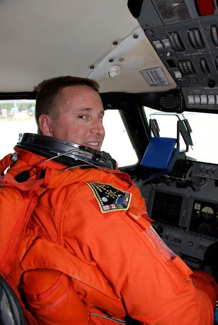 CAPE CANAVERAL, Fla. -- On the Shuttle Landing Facility at NASA's Kennedy Space Center, the pilot of the STS-124 mission, Ken Ham, sits in the cockpit of the shuttle training aircraft, or STA. He is getting ready to practice landing the shuttle on the SLF runway. The STA is a Grumman American Aviation-built Gulf Stream II jet that was modified to simulate an orbiter's cockpit, motion and visual cues, and handling qualities. In flight, the aircraft duplicates the orbiter's atmospheric descent trajectory from approximately 35,000 feet altitude to landing on a runway. Space shuttle Discovery is scheduled to lift off on the STS-124 mission at 5:02 p.m. May 31. Photo credit: NASA/Kim Shiflett