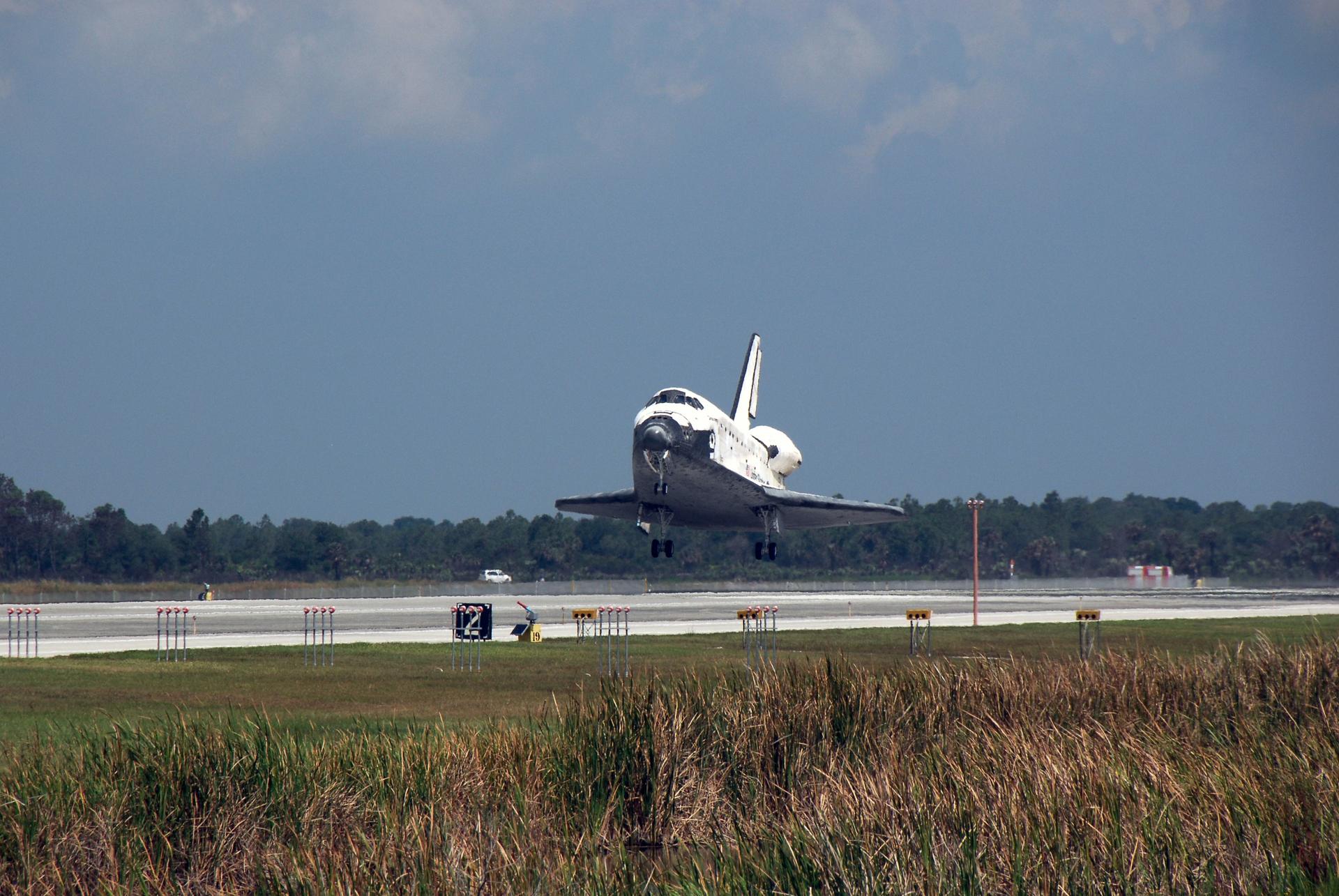 CAPE CANAVERAL, Fla. – In the 69th landing at NASA's Kennedy Space Center, space shuttle Discovery approaches landing on Runway 15 to end the STS-124 mission, a 14-day flight to the International Space Station. The main landing gear touched down at 11:15:19 a.m. EDT. The nose landing gear touched down at 11:15:30 a.m. and wheel stop was at 11:16:19 a.m. The mission completed 5.7 million miles. The STS-124 mission delivered the Japan Aerospace Exploration Agency's large Japanese Pressurized Module and its remote manipulator system to the space station. Photo credit: NASA/Kim Shiflett