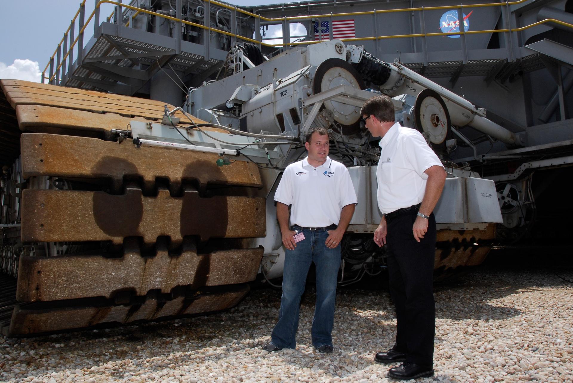 CAPE CANAVERAL, Fla. – 2008 Daytona 500 winner Ryan Newman learns more from Gordon Coffey, NASA systems engineer, about the crawler-transporter behind him. Standing 20 feet tall, the crawler weighs 5.5 million pounds unloaded. It has 16 traction motors of 375 hp each and only travels 2 mph unloaded. Newman is visiting Kennedy in honor of NASA's 50th anniversary and the 50th running of NASCAR's Daytona 500 in February. NASA presented Newman two green racing flags that were flown last February aboard space shuttle Atlantis' STS-122 mission to the International Space Station. One flag was given to Newman, the second was presented to Daytona 500 Experience General Manager Kim Isemann. A third flag that was flown will be kept by NASA for public display. The connection between NASA and Daytona's International Speedway extends beyond their close proximity to one another. During recent years, technology developed for the space program has found many uses on Earth, including helping NASCAR drivers stay safe and increase performance. Photo credit: NASA/Kim Shiflett