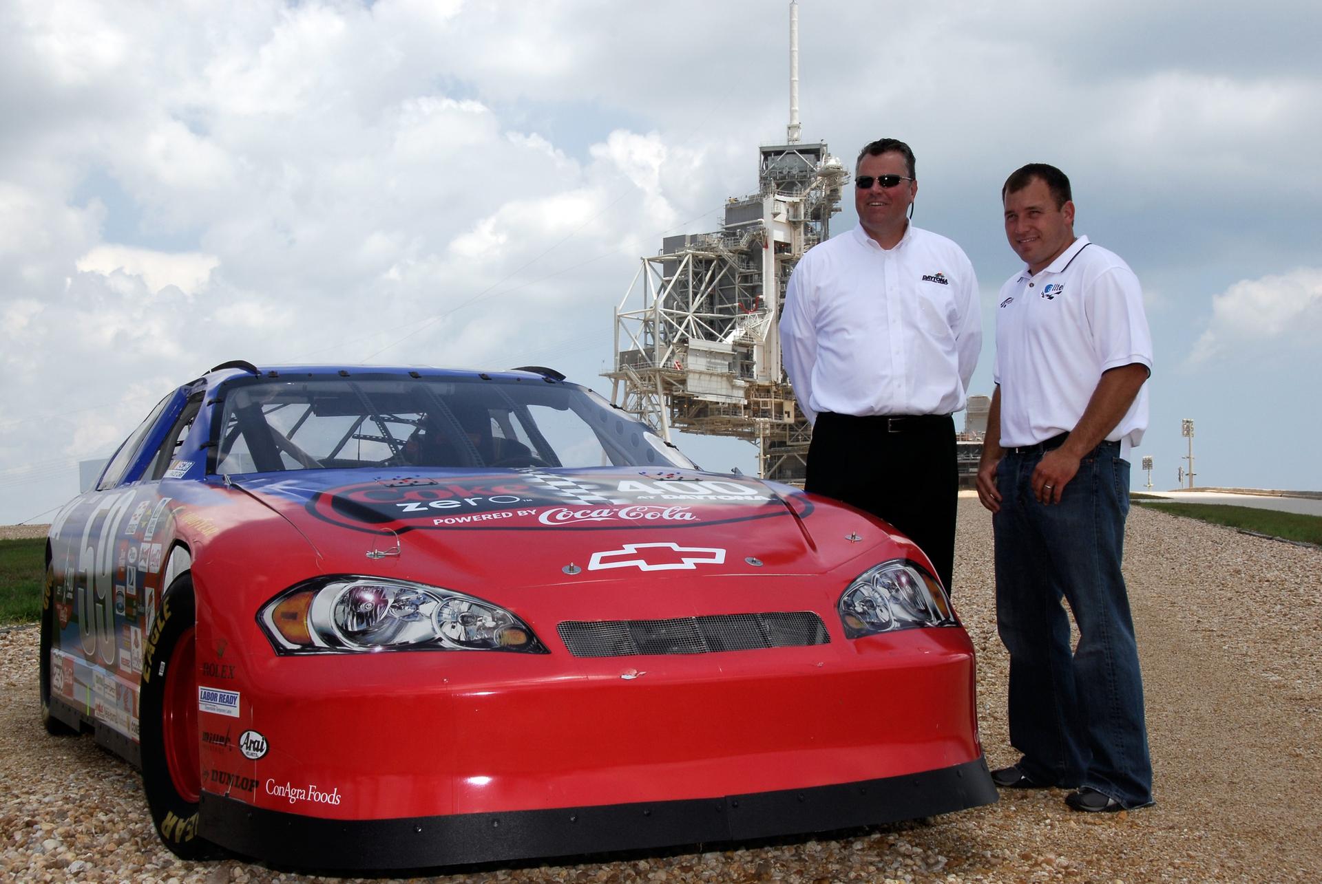 CAPE CANAVERAL, Fla. – On Launch Pad 39A at NASA's Kennedy Space Center, Daytona International Speedway President Robin Braig (left) and 2008 Daytona 500 winner Ryan Newman pose for photographers with the Daytona International Speedway show car. Newman is visiting Kennedy in honor of NASA's 50th anniversary and the 50th running of NASCAR's Daytona 500 in February. NASA presented Newman two green racing flags that were flown last February aboard space shuttle Atlantis' STS-122 mission to the International Space Station. One flag was given to Newman, the second was presented to Daytona 500 Experience General Manager Kim Isemann. A third flag that was flown will be kept by NASA for public display. The connection between NASA and Daytona's International Speedway extends beyond their close proximity to one another. During recent years, technology developed for the space program has found many uses on Earth, including helping NASCAR drivers stay safe and increase performance. Photo credit: NASA/Kim Shiflett