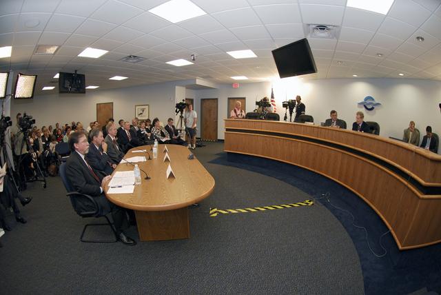 CAPE CANAVERAL, Fla. – A Senate field hearing held at the Canaveral Port Authority and chaired by Florida Sen. Bill Nelson (third from right on the dais) focuses on workforce related challenges at NASA's Kennedy Space Center and potential solutions to mitigate the transition's effects on the community. The hearing examined issues surrounding the retirement of the space shuttle and the transition to the new Orion/Ares system. At Nelson's right is Florida Sen. Mel Martinez. Seated at left are NASA representatives Deputy Associate Administrator of Exploration Systems Doug Cooke, Administrator Michael Griffin and Associate Administrator of Space Operations William Gerstenmaier. Photo credit: NASA/Kim Shiflett