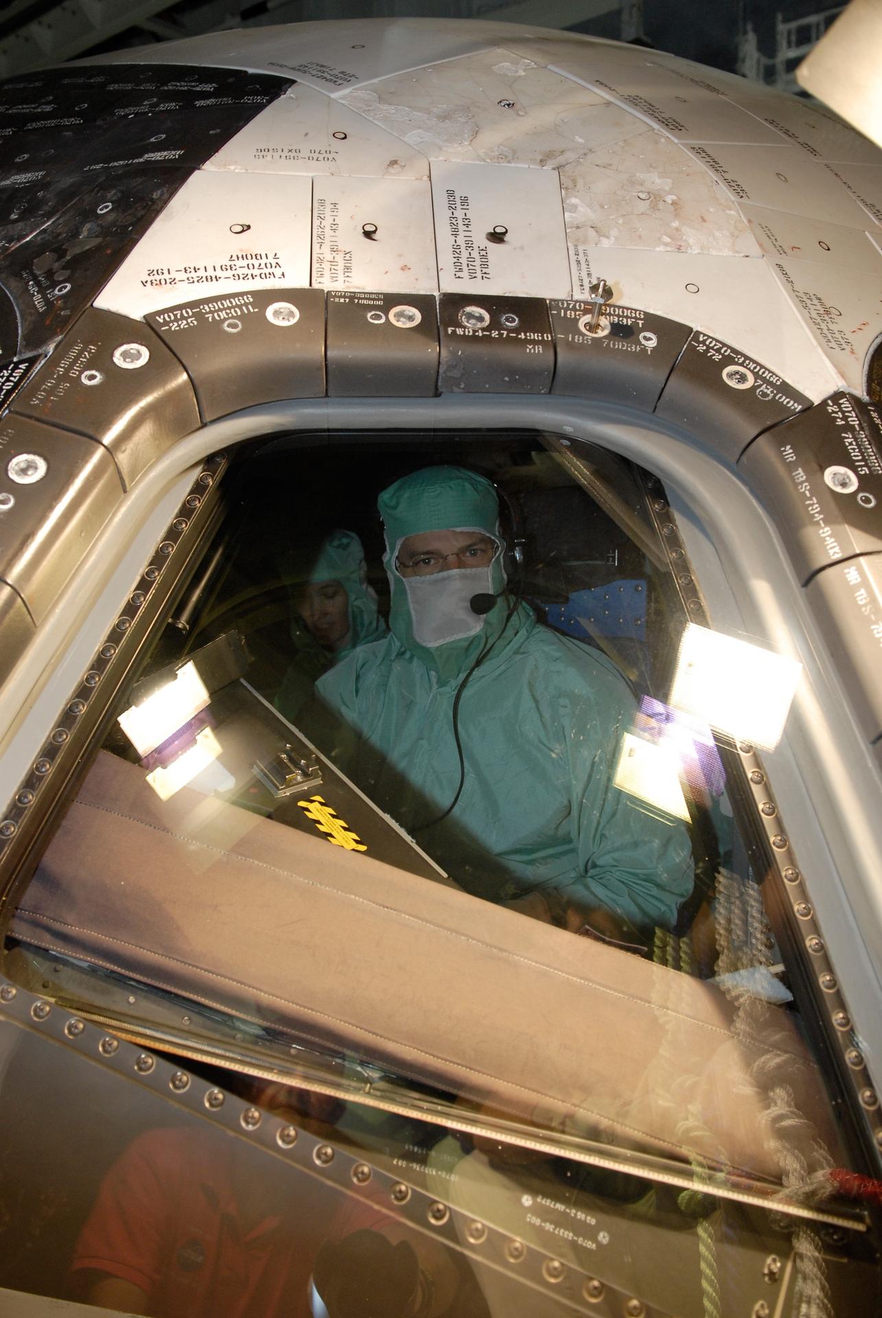 CAPE CANAVERAL, Fla. – In the Orbiter Processing Facility at NASA's Kennedy Space Center, STS-125 Commander Scott Altman examines the cockpit window on space shuttle Atlantis, checking for sharp edges. The inspection is part of the crew equipment interface test, which provides hands-on experience with hardware and equipment for the mission. Atlantis is targeted to launch Oct. 8 on the STS-125 mission to service the Hubble Space Telescope. The mission crew will perform history-making, on-orbit “surgery” on two important science instruments aboard the telescope. After capturing the telescope, two teams of spacewalking astronauts will perform the repairs during five planned spacewalks. Photo credit: NASA/Kim Shiflett