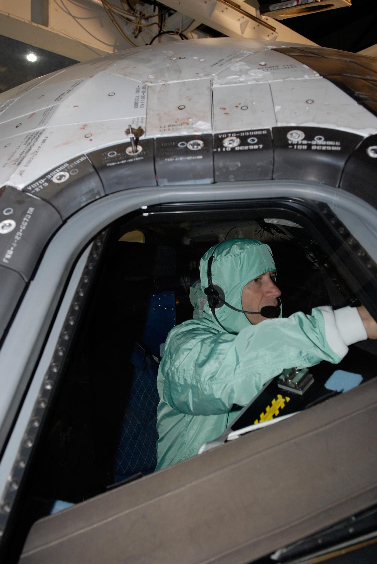 CAPE CANAVERAL, Fla. – In the Orbiter Processing Facility at NASA's Kennedy Space Center, STS-125 Pilot Gregory C. Johnson examines the cockpit window on space shuttle Atlantis, checking for sharp edges. The inspection is part of the crew equipment interface test, which provides hands-on experience with hardware and equipment for the mission. Atlantis is targeted to launch Oct. 8 on the STS-125 mission to service the Hubble Space Telescope. The mission crew will perform history-making, on-orbit “surgery” on two important science instruments aboard the telescope. After capturing the telescope, two teams of spacewalking astronauts will perform the repairs during five planned spacewalks. Photo credit: NASA/Kim Shiflett