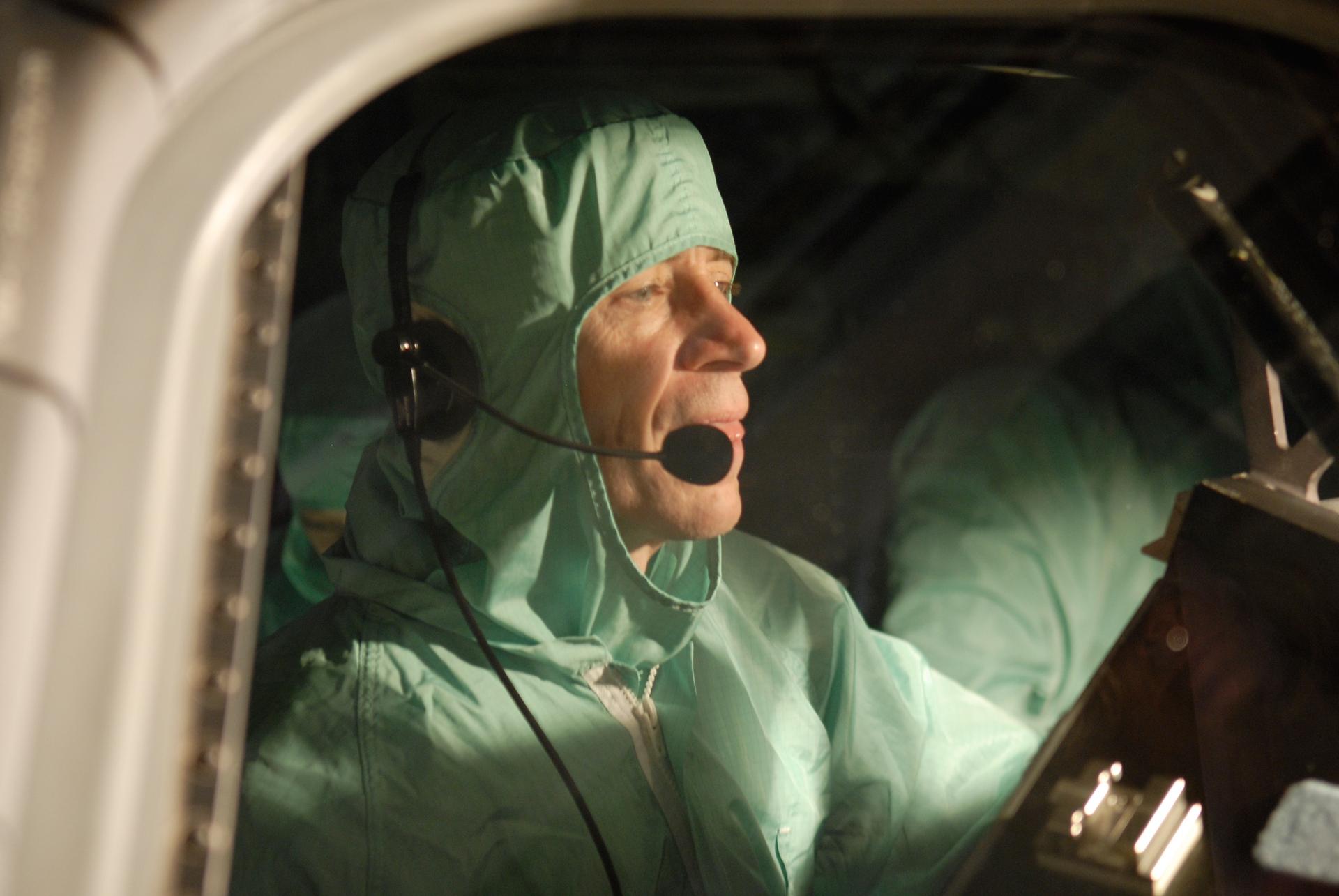 CAPE CANAVERAL, Fla. – In the Orbiter Processing Facility at NASA's Kennedy Space Center, STS-125 Pilot Gregory C. Johnson examines the cockpit window on space shuttle Atlantis, checking for sharp edges. The inspection is part of the crew equipment interface test, which provides hands-on experience with hardware and equipment for the mission. Atlantis is targeted to launch Oct. 8 on the STS-125 mission to service the Hubble Space Telescope. The mission crew will perform history-making, on-orbit “surgery” on two important science instruments aboard the telescope. After capturing the telescope, two teams of spacewalking astronauts will perform the repairs during five planned spacewalks. Photo credit: NASA/Kim Shiflett
