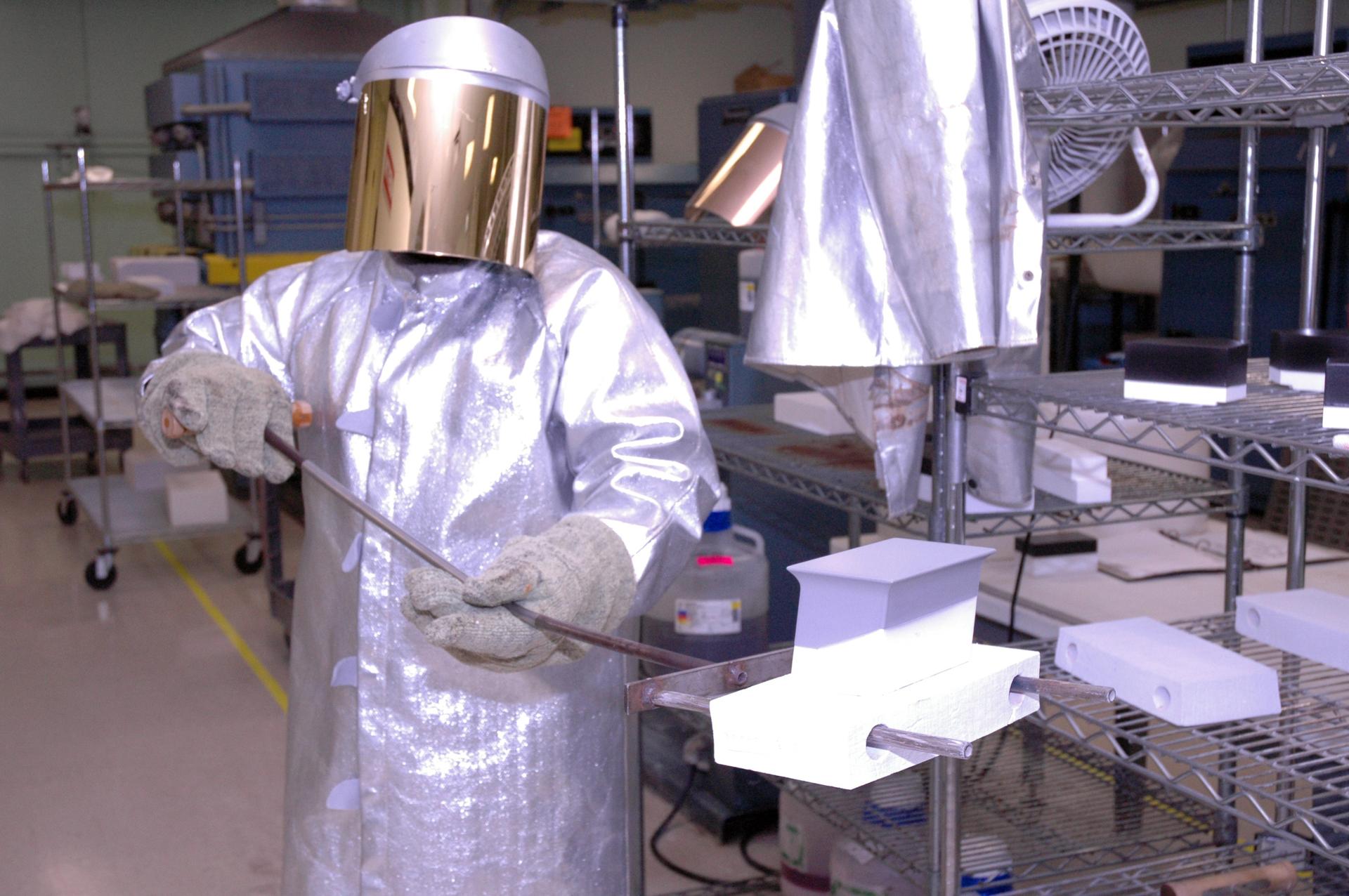 CAPE CANAVERAL, Fla. – In the tile shop at NASA's Kennedy Space Center, a worker is ready to place a Boeing Replacement Insulation 18, or BRI-18, tile in the oven. The tile will be baked at 2,200 degrees Fahrenheit to cure the ceramic coating, part of the process to prepare the tiles for installation on space shuttles. BRI-18 is the strongest material used for thermal insulation on the orbiters and, when coated to produce toughened unipiece fibrous insulation, provides a tile with extremely high-impact resistance. It is replacing other tiles on areas of the vehicle where impact risk is high, such as the landing gear doors, the wing leading edge and the external tank doors. Photo credit: NASA/Jim Grossmann