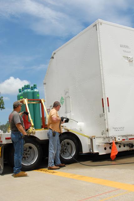 CAPE CANAVERAL, Fla. – At the Canister Rotation Facility at NASA's Kennedy Space Center, workers steam clean the shipping containers holding the first major flight hardware for space shuttle Atlantis' STS-125 mission to NASA's Hubble Space Telescope. The containers will next be moved to the airlock in the Payload Hazardous Servicing facility where the hardware will be prepared for its targeted October launch. The payload carriers will be prepared for the integration of telescope science instruments, both internal and external replacement components, as well as the flight support equipment to be used by the astronauts during the servicing mission. The three payload carriers or pallets are the Flight Support System, the Super Lightweight Interchangeable Carrier and the Orbital Replacement Unit Carrier. At the end of July, a fourth and final carrier, the Multi-Use Lightweight Equipment carrier will join the others in the Payload Hazardous Servicing Facility where the Hubble payload is being prepared for launch. Photo credit: NASA/Jack Pfaller