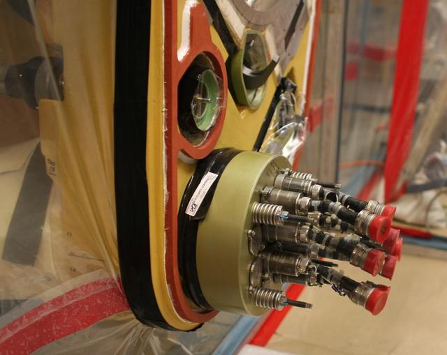 CAPE CANAVERAL, Fla. – Inside a test cell in the Vehicle Assembly Building at NASA's Kennedy Space Center, a portion of Atlantis’ external tank is sealed to prevent contamination so that technicians can remove a valve after small dings were found on the sealing surface of the quick disconnect system that handles liquid-hydrogen fuel for the shuttle’s three main engines. The tank will be attached to the twin solid rocket boosters on Aug. 3 for the STS-125 mission, the fifth and final shuttle servicing mission to NASA’s Hubble Space Telescope. During the mission, the crew will install new instruments on the telescope, including the Cosmic Origins Spectrograph and the Wide Field Camera 3. A refurbished Fine Guidance Sensor will replace one unit of three now onboard. Mission specialists will also install new gyroscopes, batteries and thermal blankets on the telescope. Launch is targeted for Oct. 8. Photo credit: NASA/Dimitri Gerondidakis
