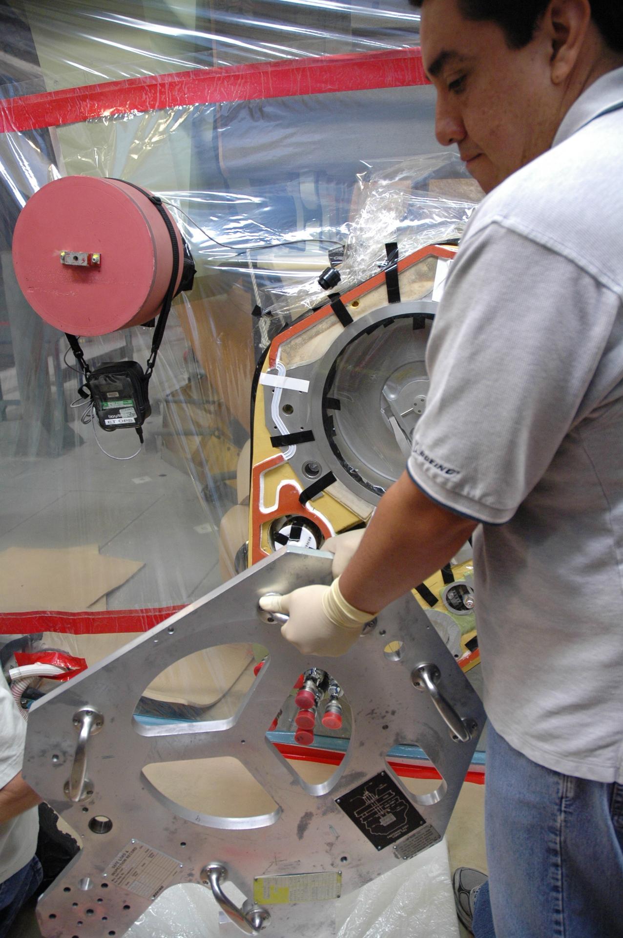 CAPE CANAVERAL, Fla. – Inside the Vehicle Assembly Building at NASA’s Kennedy Space Center, a technician prepares to install a plate cover over the quick disconnect system on Atlantis’ external tank. A valve was removed and replaced after small dings were found on the sealing surface of the quick disconnect system that handles liquid-hydrogen fuel for the shuttle’s three main engines. The tank will be attached to the twin solid rocket boosters on Aug. 3 for the STS-125 mission, the fifth and final shuttle servicing mission to NASA’s Hubble Space Telescope. During the mission, the crew will install new instruments on the telescope, including the Cosmic Origins Spectrograph and the Wide Field Camera 3. A refurbished Fine Guidance Sensor will replace one unit of three now onboard. Mission specialists will also install new gyroscopes, batteries and thermal blankets on the telescope. Launch is targeted for Oct. 8. Photo credit: NASA/Jim Grossmann