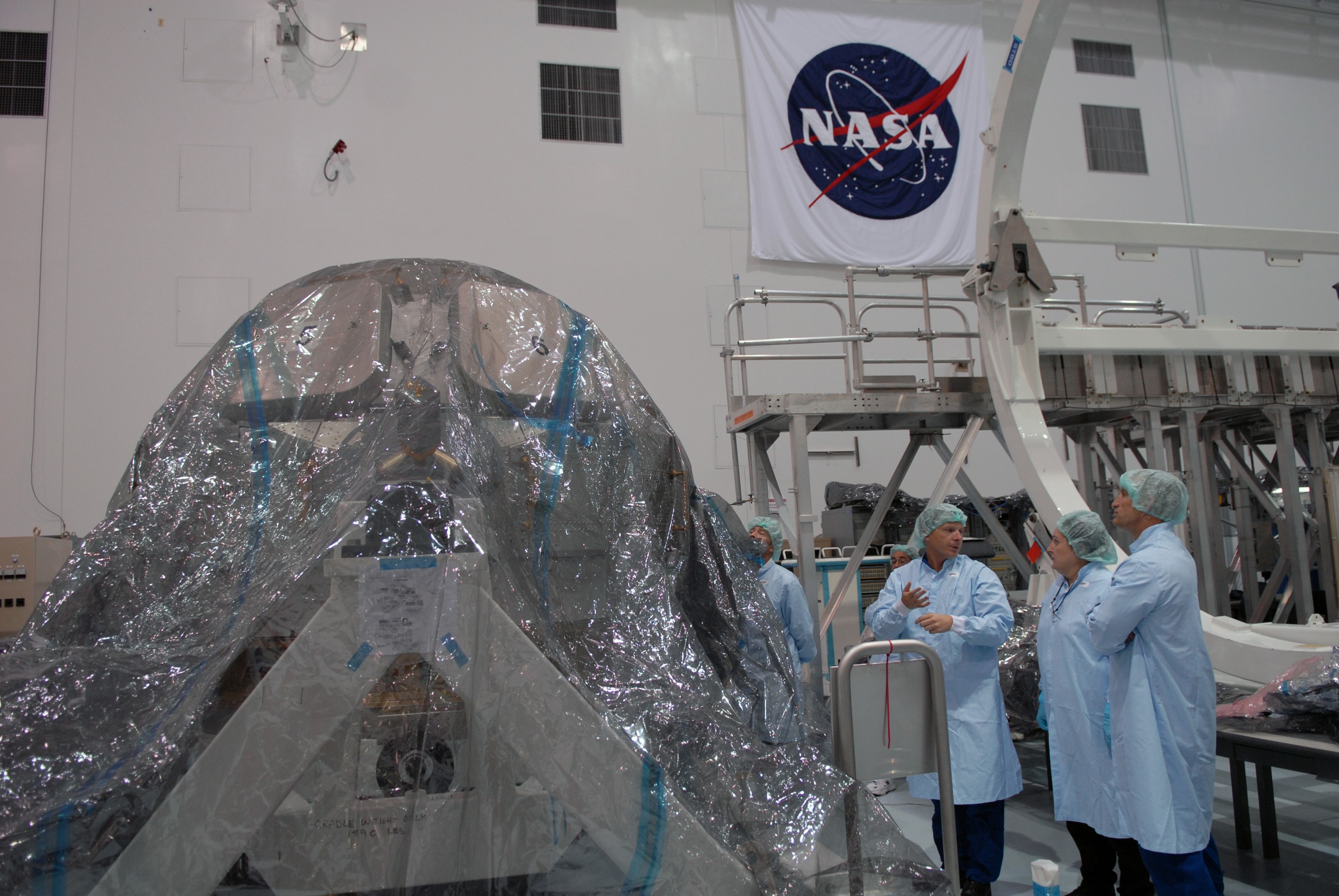 CAPE CANAVERAL, Fla. – In the Space Station Processing Facility at NASA's Kennedy Space Center, astronaut Terry Virts, third from left, discusses the intricacies of the International Space Station's Cupola module with vehicle integration test engineer Louise Kleba of Flight Crew Operations and astronaut Charles Hobaugh, right. The module was delivered by the European Space Agency in 2004 to Kennedy from Alenia Spazio in Turin, Italy. Cupola will provide unprecedented views of activities outside the station and spectacular views of the Earth. Crew members working inside the module will have a 360-degree panoramic view. Cupola has the capability for command and control workstations to be installed to assist in space station remote manipulator system and extra vehicular activities. Cupola is the final element of the space station core and is scheduled for launch on space shuttle Endeavour's STS-130 mission, targeted for Dec. 10, 2009. Photo credit: NASA/Cory Huston